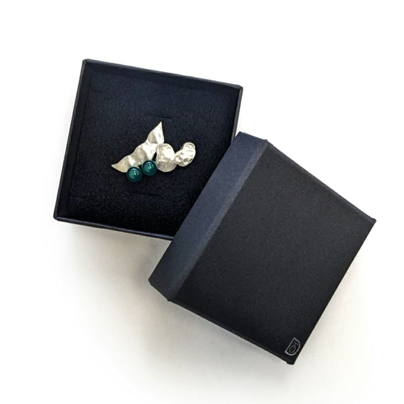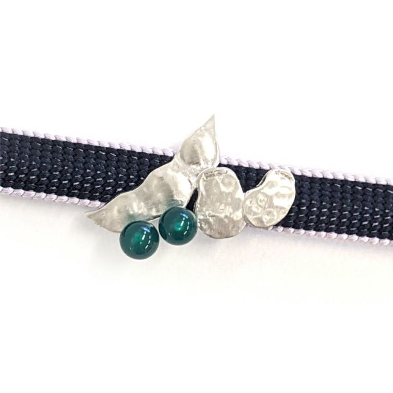 エメラルドグリーンの石、グリーンアゲートの実をつけた枝豆とソラマメが並んだ洒落た帯留めです。