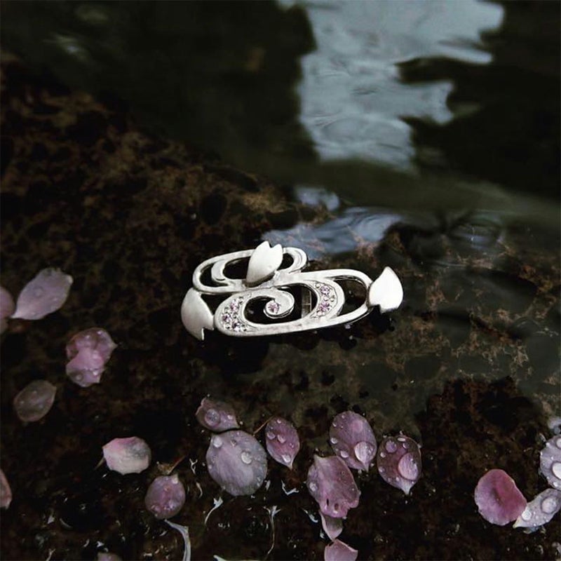 水面に舞い散る桜の花びらを、帯留めとして美しく表現。