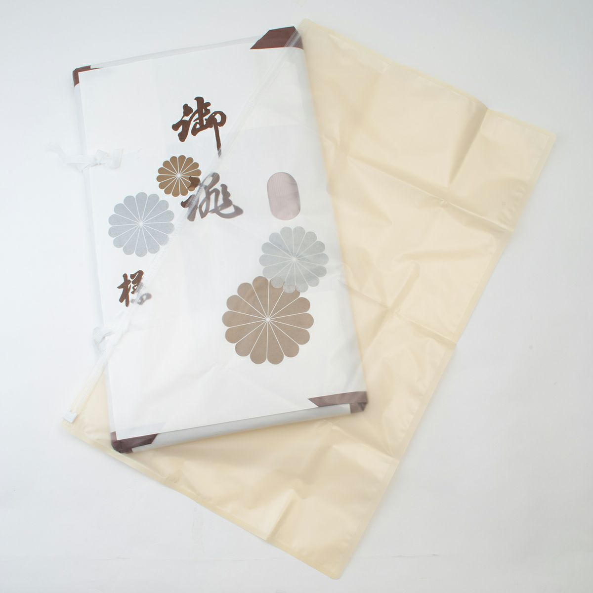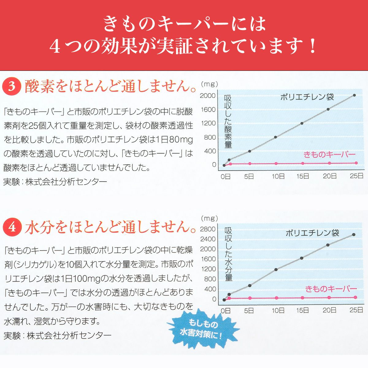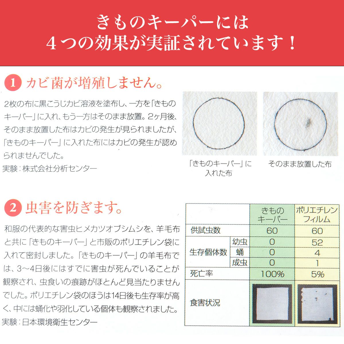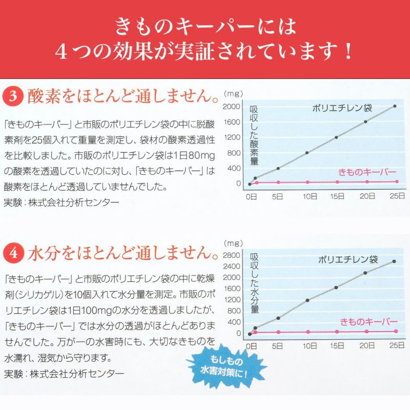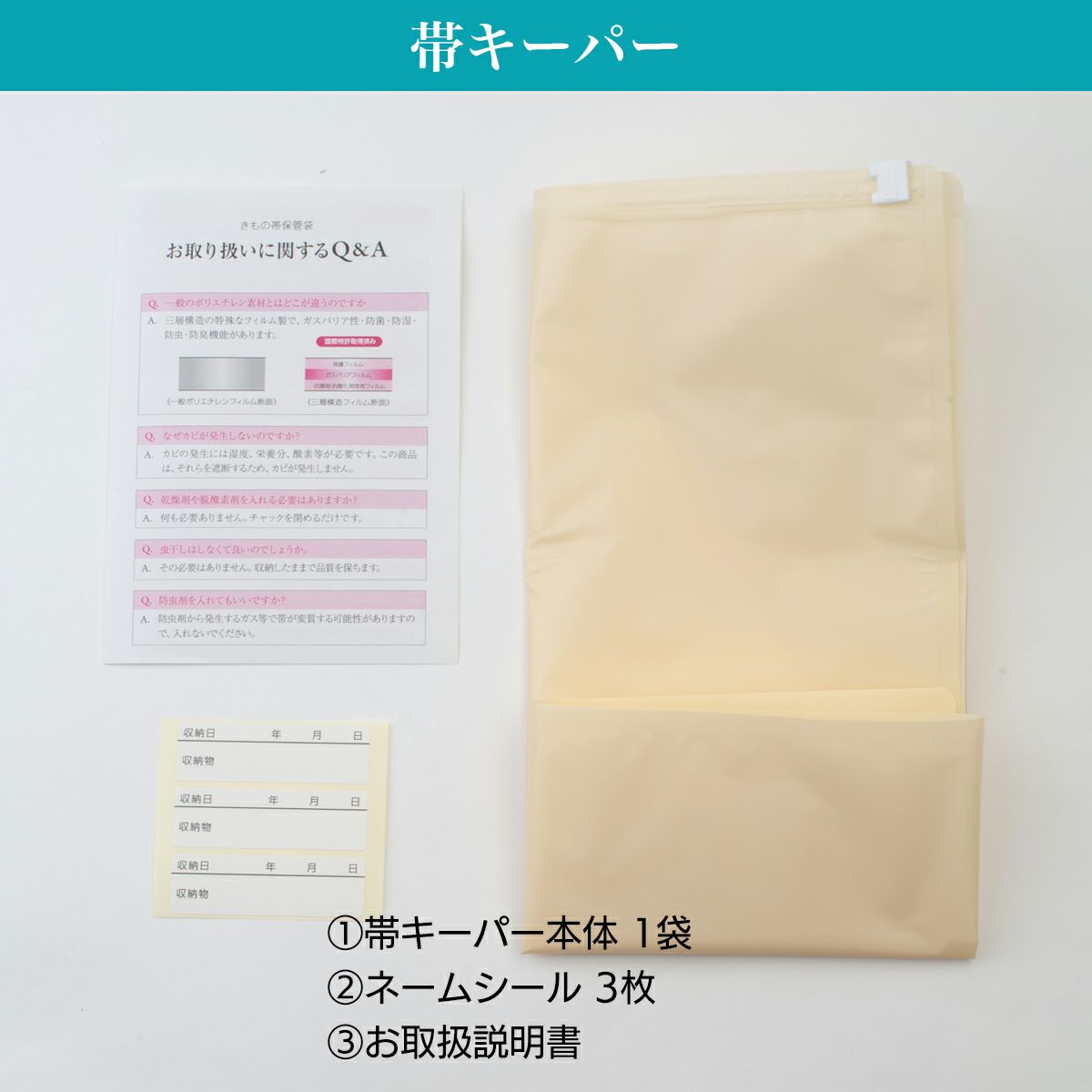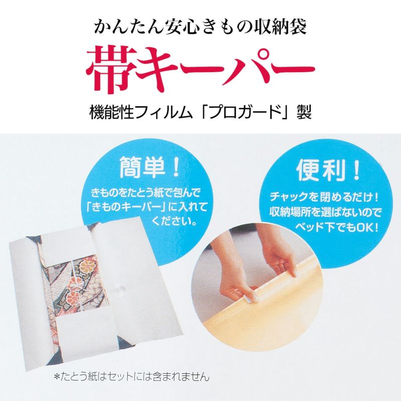 かんたん安心きもの収納袋「きものキーパー」の姉妹商品「帯キーパー」です。 帯をたとう紙に入れ、「帯キーパー」にたとう紙ごと入れてください。 抗菌、抗酸化剤含有フィルム、ガスバリアフィルム、保護フィルムの三層構造になっており、大切な着物を湿気、カビ、虫害から守り、また着物の変色も防ぎます。 もう防虫剤は不要です。面倒な虫干しも不要です。頼りになる収納袋です!