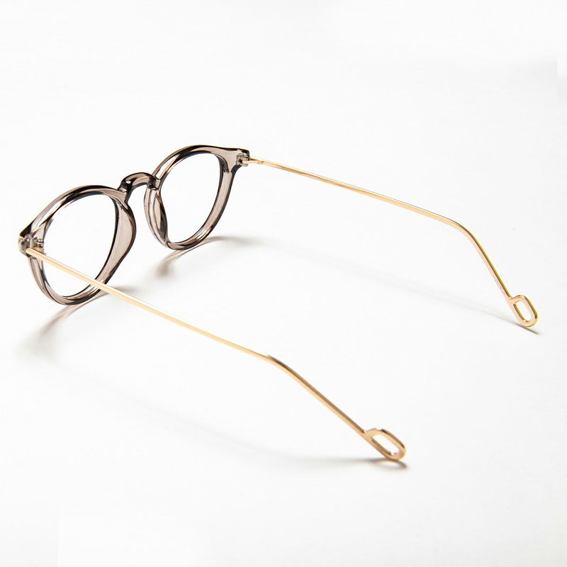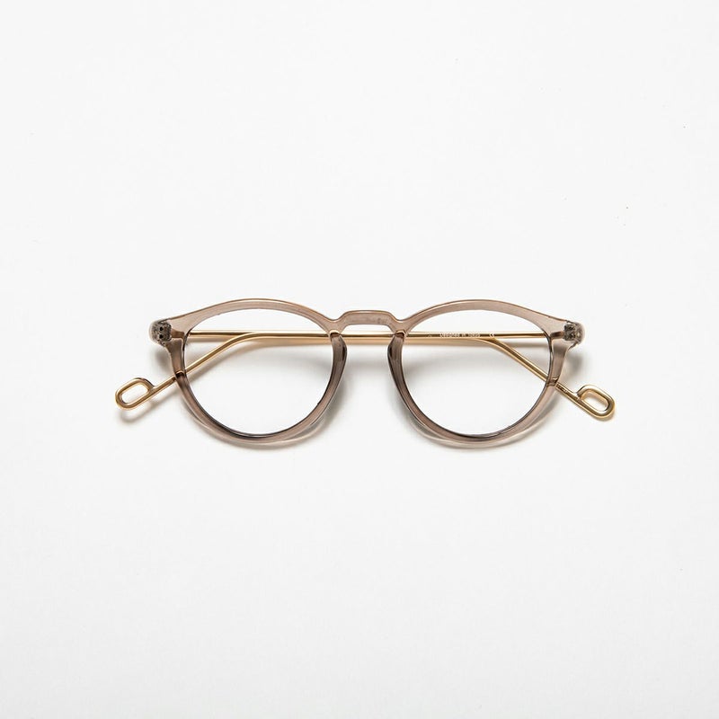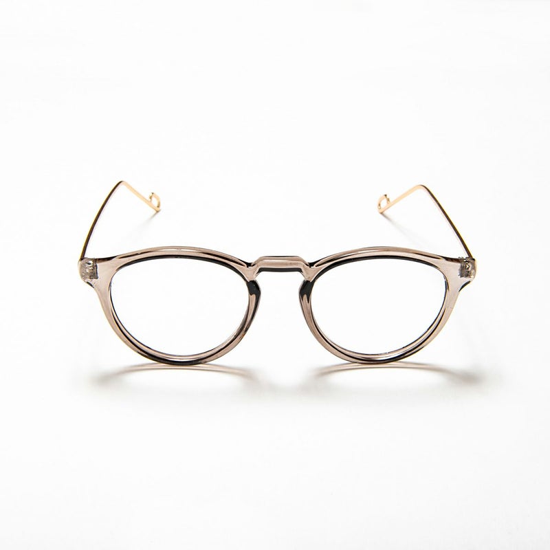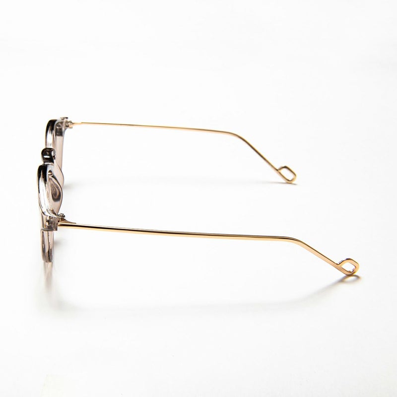 丸みを帯びたプラスチックフレームにすっきりとしたメタルテンプルを合わせることで、甘くなり過ぎず、こなれた印象に。