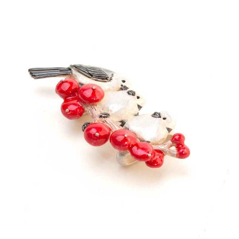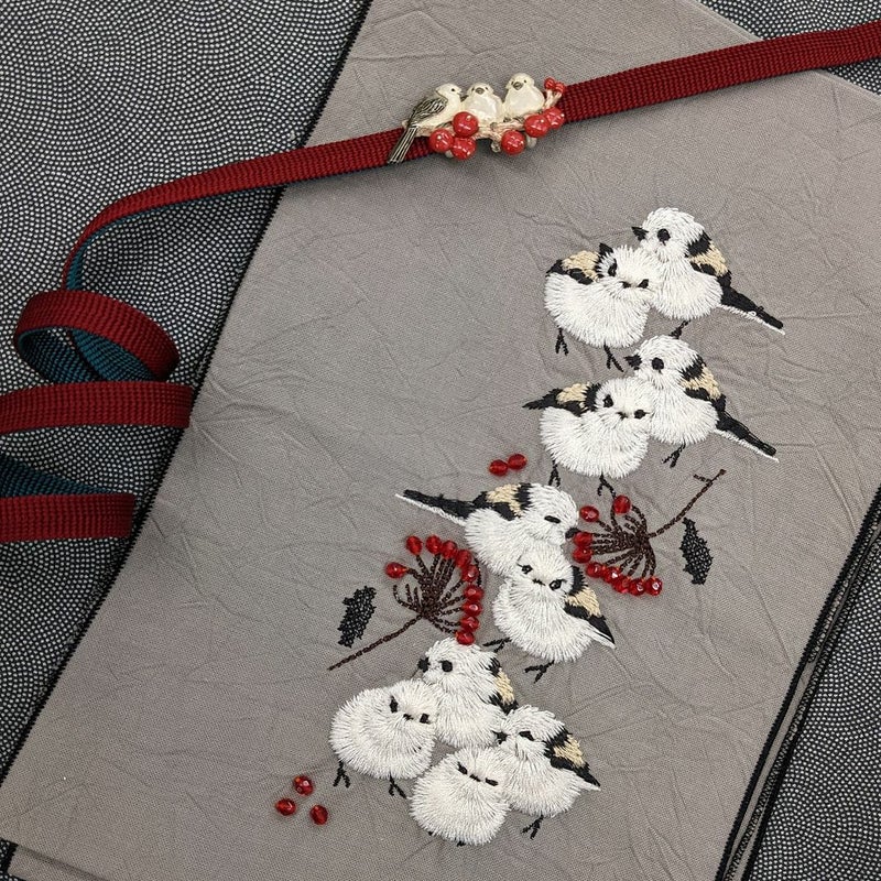 寒い地域に生息するシマエナガと、冬に実を付ける南天をモチーフにした帯留めです。