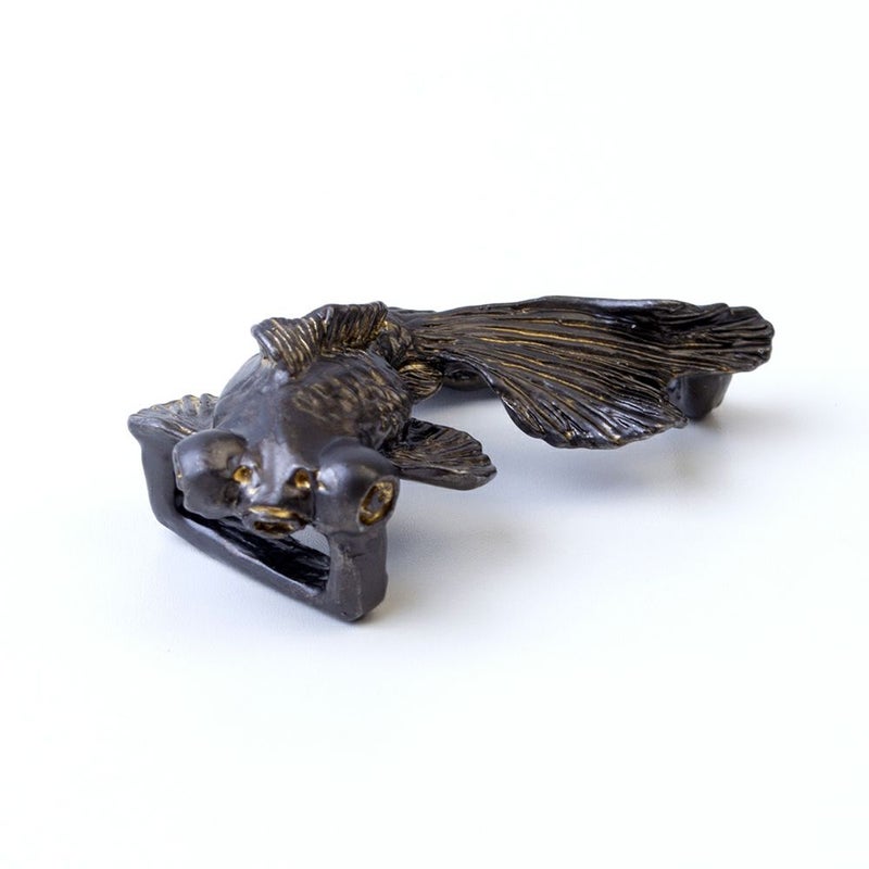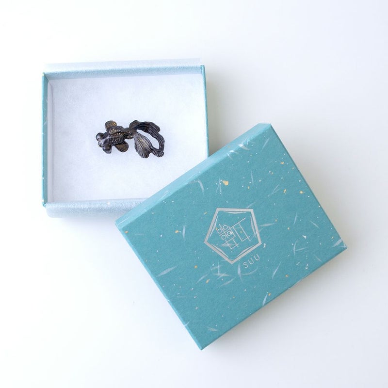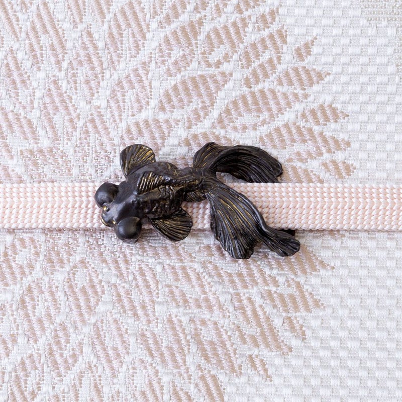 SUUさんの帯留のファンで、少しづつ集めています。赤い出目金さんを持っていますが、泳ぎ出しそうな動きのあるデザインが素敵で、藍染めの有松絞り浴衣などにあわせています。黒い出目金さんは白や水色などの夏着物や浴衣にあわせて、涼し気に着たいですね。黒がなかなか見つからなかったので、まだ冬ですが購入しました。