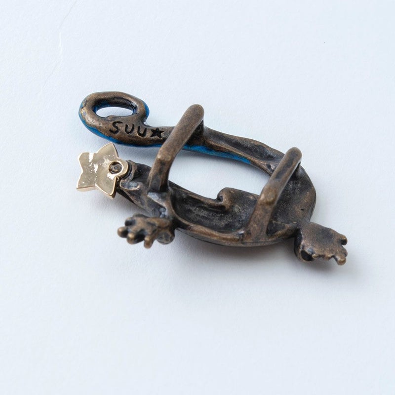 きれいな星を見つけ、口にくわえるニホントカゲくんの顔がどこか誇らしげな帯留めです。
