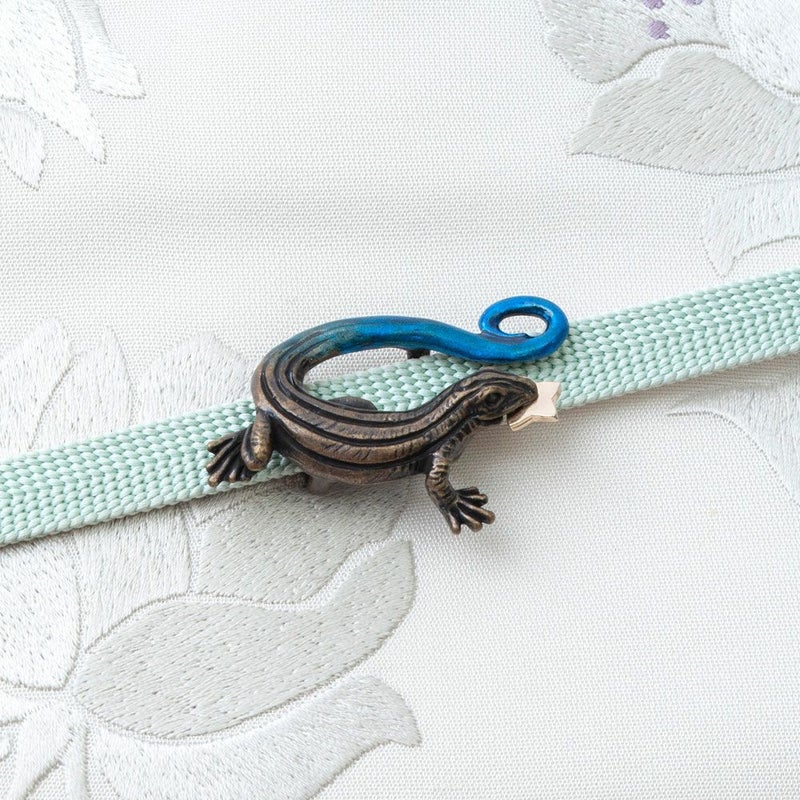 青い尻尾が特徴のニホントカゲの子供の帯留めです。