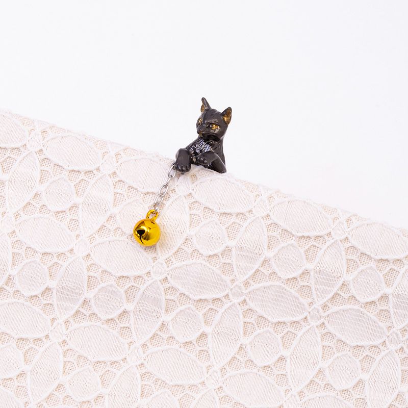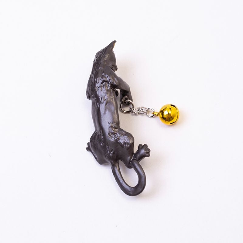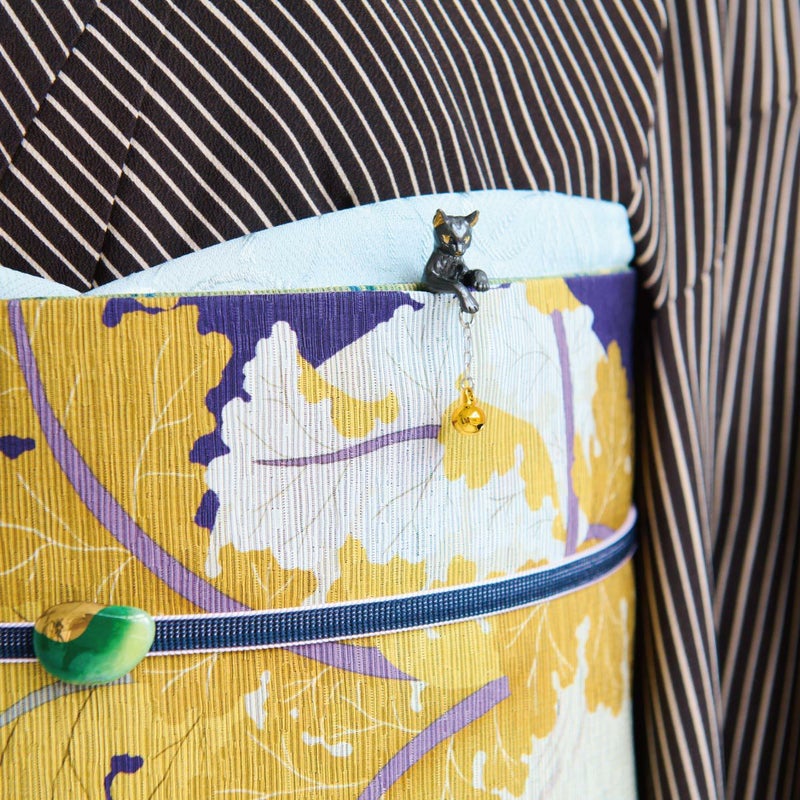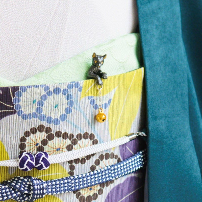 やんちゃな黒猫が帯から身を乗り出して鈴を取ろうとしているモチーフです。