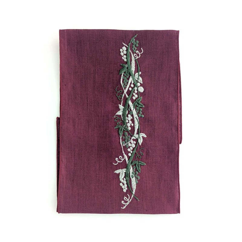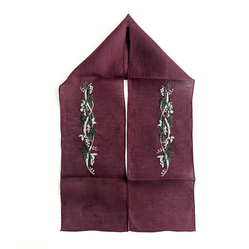 ワイン色のリネンにグレイとモスグリーンの糸で流れるようなぶどうの蔓を刺繍をした優雅な半襟です。