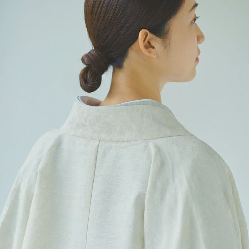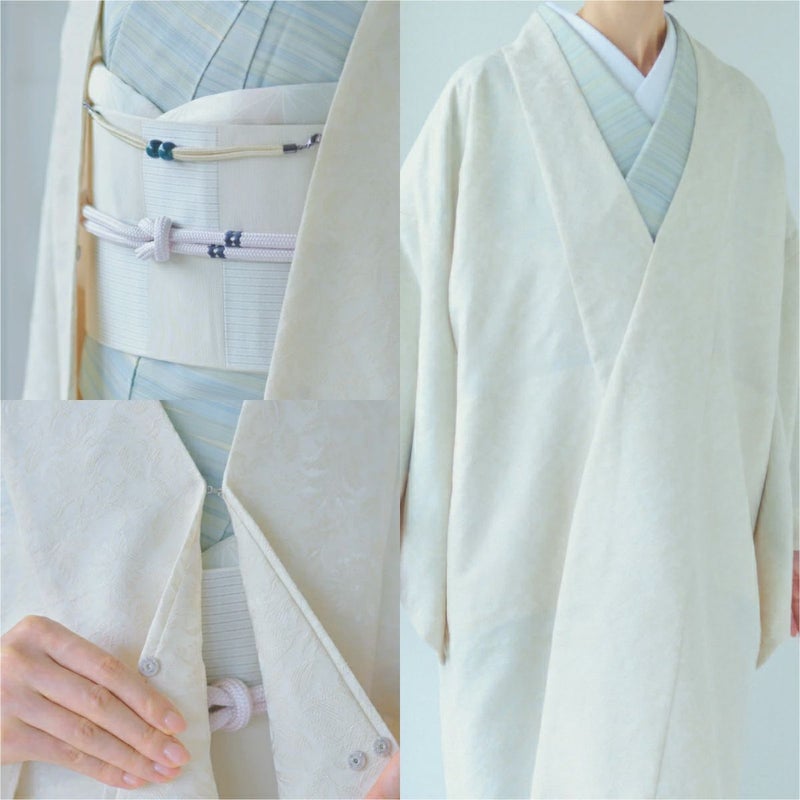 フロントホックで衿元を留めることができます。またホックに羽織紐を付けて異なるスタイリングを楽しむこともできます。
