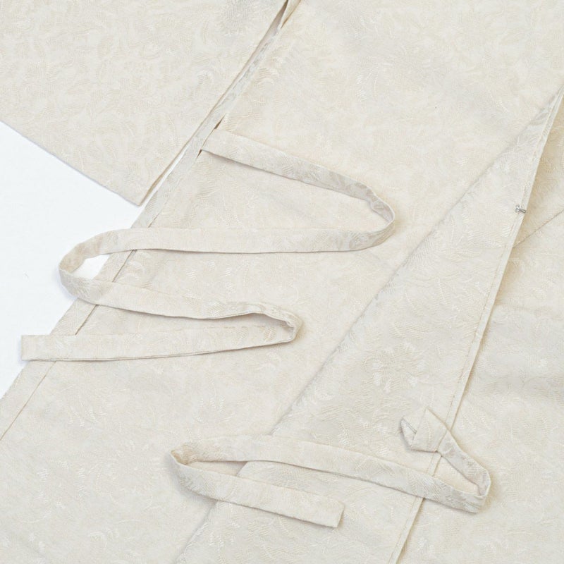 道中着【更紗】には、下前に長尺の紐を取り付けました。長尺の紐でぐるりと胴回りを一周させ、右脇の穴から表に引き出して上前の紐と結びます。