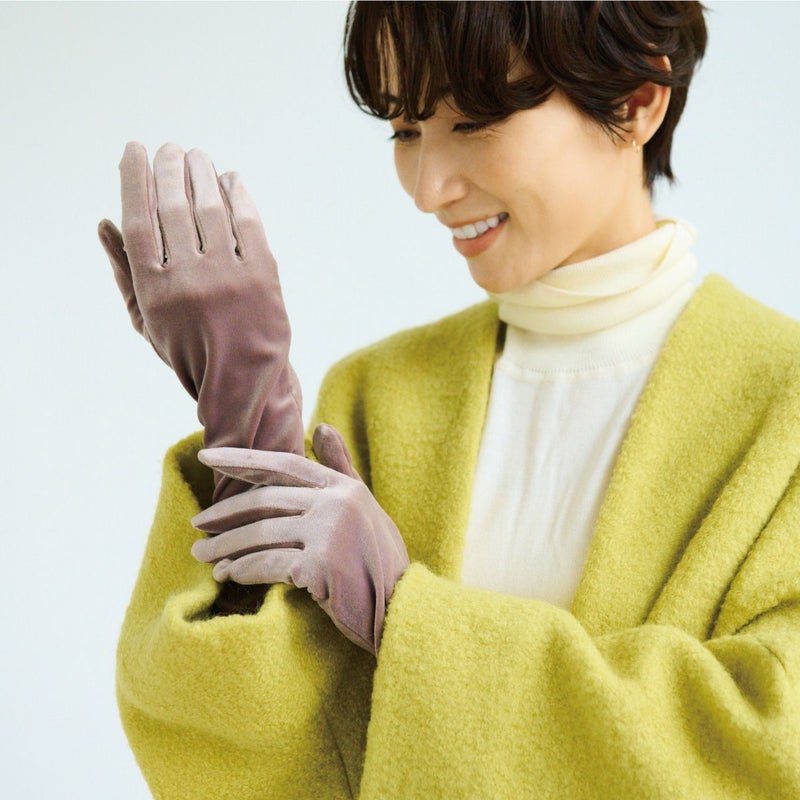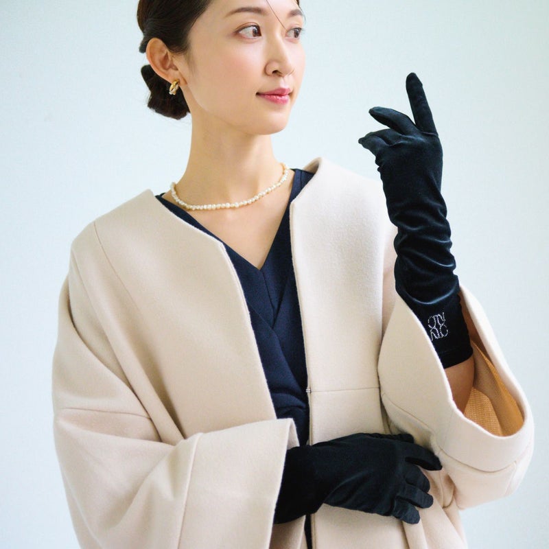 光沢の美しいベロア素材を使用したグローブは、シンプルを極めたデザインが、素材の風合いと仕立ての美しさを際立たせます。