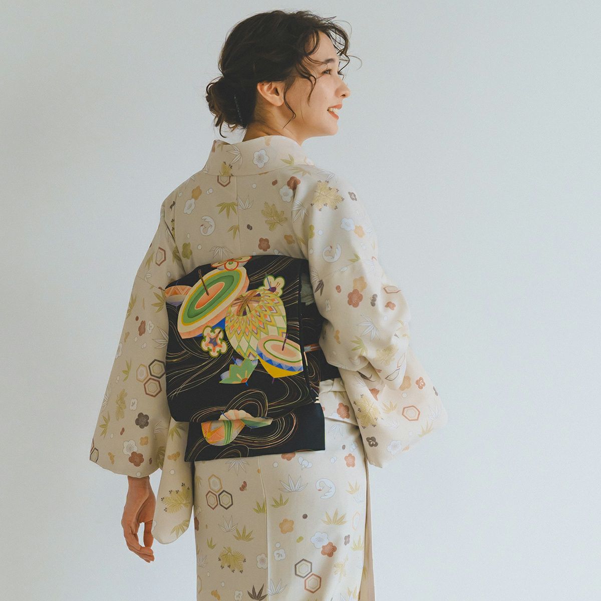 お祝いの気持ちを込めた装いをしたい時はもちろん、コロンと可愛らしく描かれた文様には普段使いしやすい気軽さもあるので、帯あわせで着用シーンの広がる一枚です。