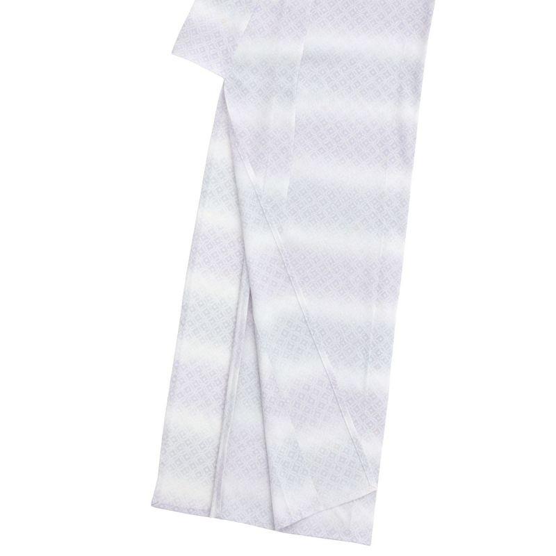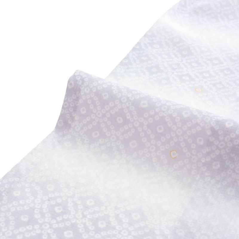 絞り染め技法の一つ「鹿の子(かのこ)」を型染めで白揚げに表した上に、二色の暈しを重ねて、柄を浮かび上がらせています。
