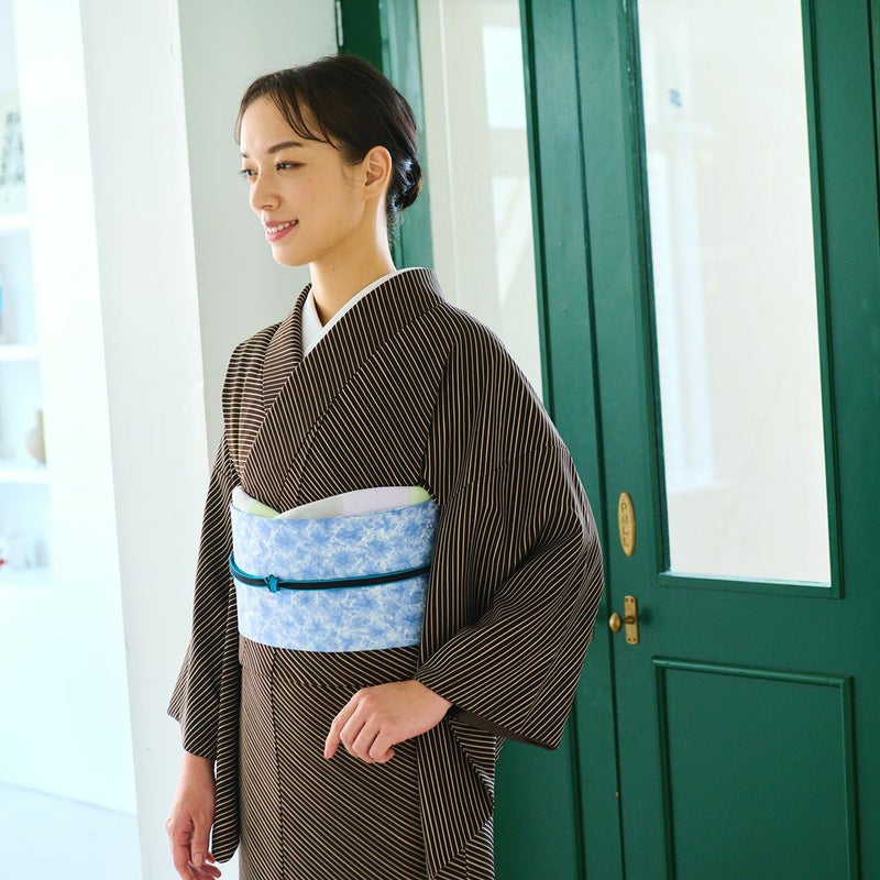 粋な柄の代表ともいえる縞柄を少し斜めに傾けることで、柔らかさとニュアンスが出てコーディネートの幅が広い着物になりました。