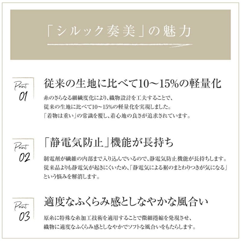 生地に採用した【東レシルック奏美】は、絹に近いしなやかな手触りが特徴のシルックの中でも、特に風合いと機能性が向上した高品質素材です。