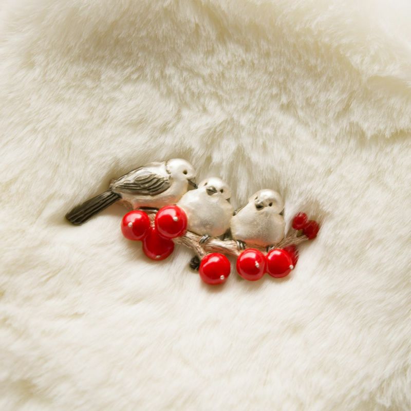 雪景色の中でほっこりとするようなワンシーンを切り取ったアイテムです。シマエナガたちが南天の枝にとまり、楽しそうにお喋りをしているようです。