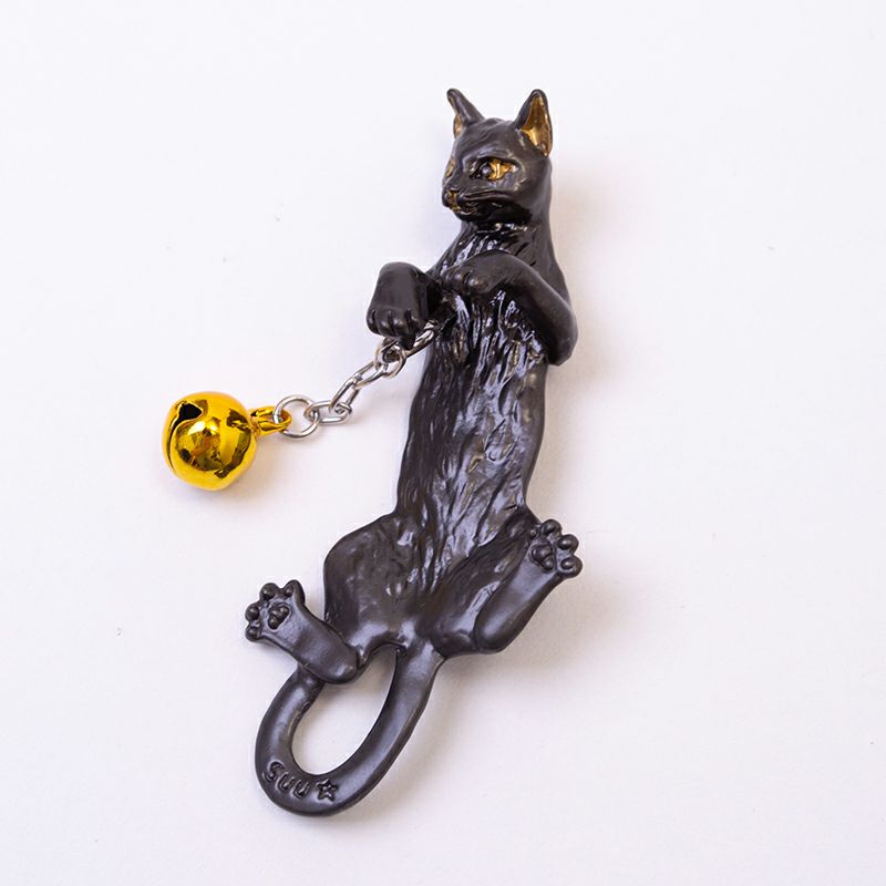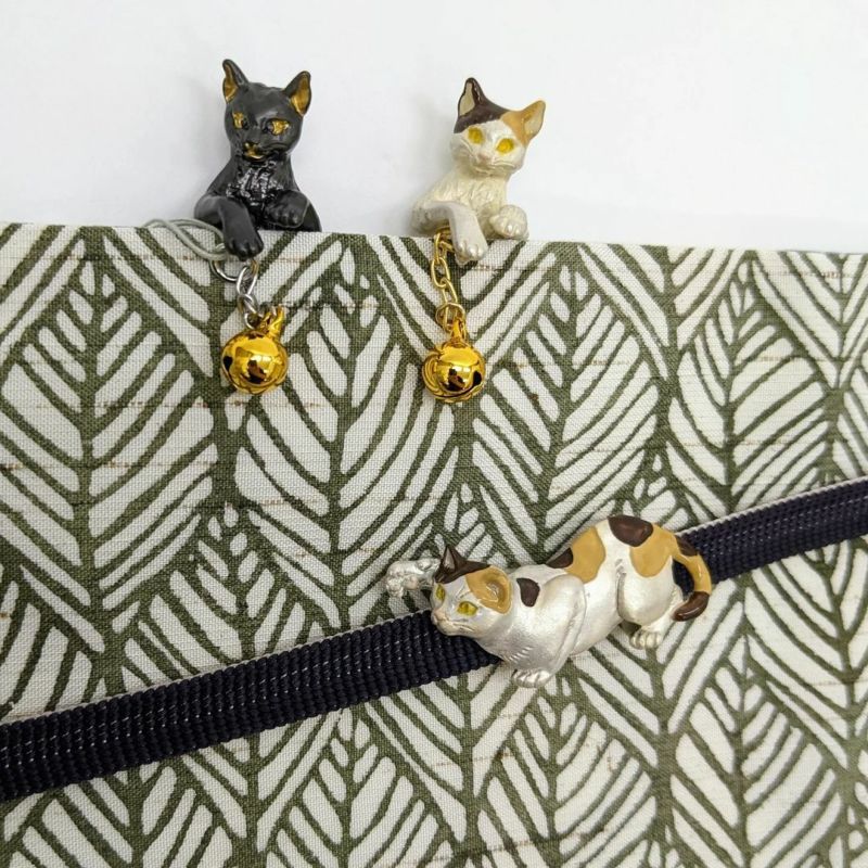 やんちゃな黒猫が帯から身を乗り出して鈴を取ろうとしているモチーフです。
