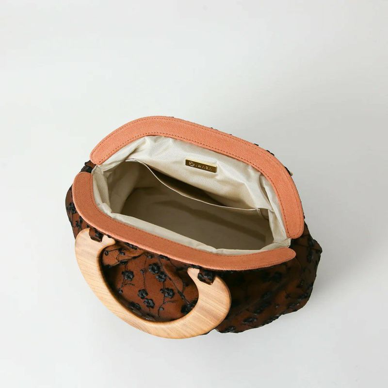 表地に使用した生地は、オーガンジーの素材に小花が立体的に施されたジャガード刺繍生地。オーガンジーと下の生地を浮かせることでレースの透け感をより感じて頂ける仕立てです。