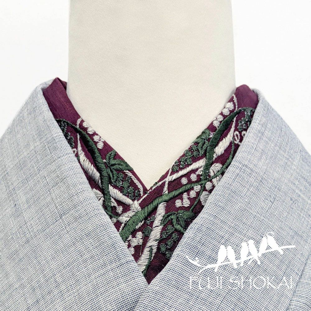 ワイン色のリネンにグレイとモスグリーンの糸で流れるようなぶどうの蔓を刺繍をした優雅な半襟です。