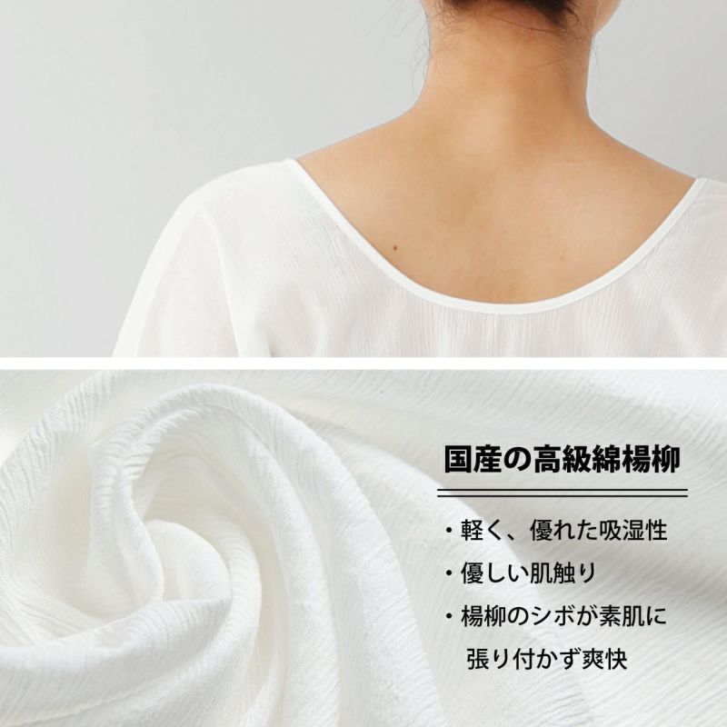 広めの衿ぐり、柔らかく涼やかな着心地の綿楊柳