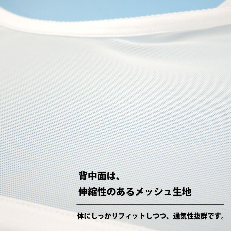 伸縮性のあるメッシュ生地が体にしっかりフィットします。通気性抜群で爽やかな着心地です。
