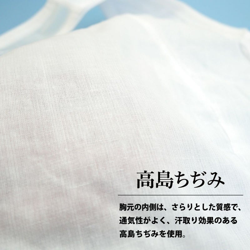 胸周りに汗取り効果のある高島ちぢみを使用、伸縮性のあるメッシュ生地で爽やかな着心地です。