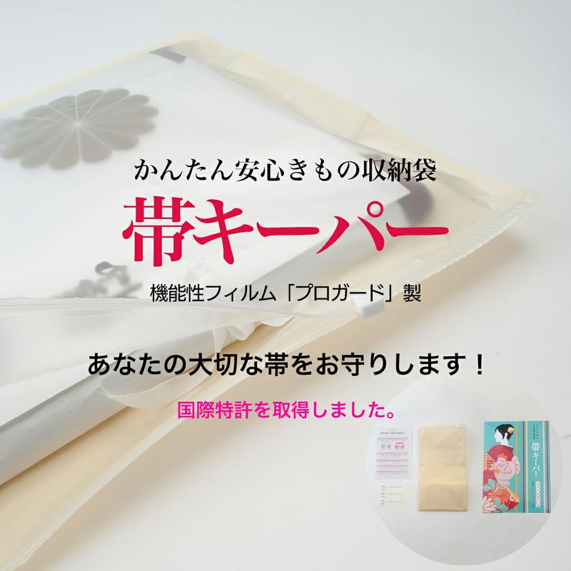 かんたん安心きもの収納袋「きものキーパー」の姉妹商品「帯キーパー」です。 帯をたとう紙に入れ、「帯キーパー」にたとう紙ごと入れてください。 抗菌、抗酸化剤含有フィルム、ガスバリアフィルム、保護フィルムの三層構造になっており、大切な着物を湿気、カビ、虫害から守り、また着物の変色も防ぎます。 もう防虫剤は不要です。面倒な虫干しも不要です。頼りになる収納袋です!