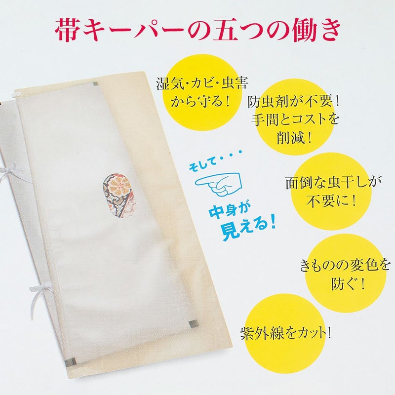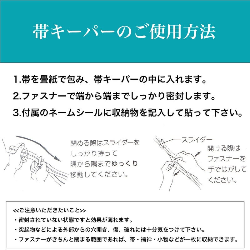 シーズンオフになった帯の保管には「帯キーパー」での保存がお薦めです。 たとう紙に包んで、キーパーの袋に入れてファスナーを締めるだけでOK! 一袋に付き、帯なら2〜3枚程度が収納可能です。