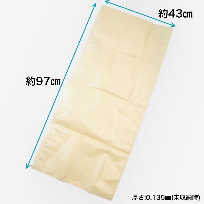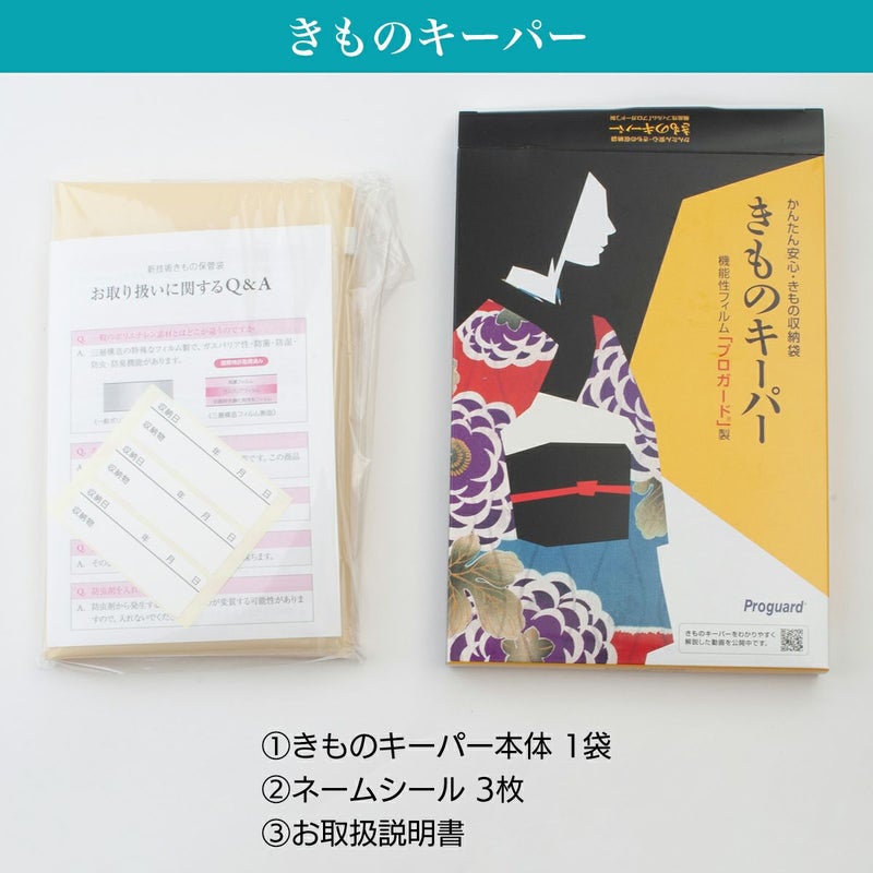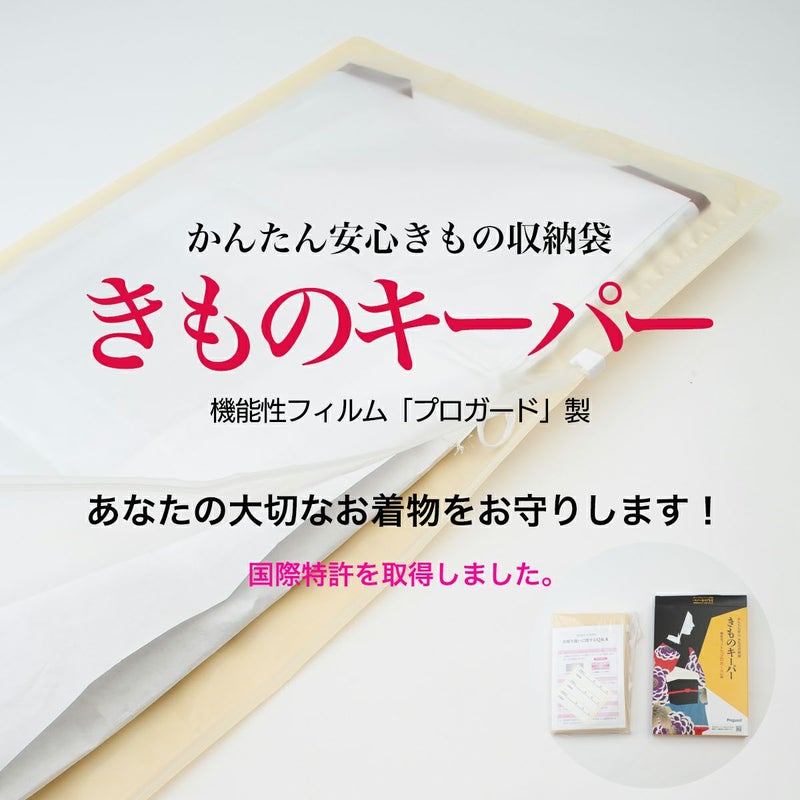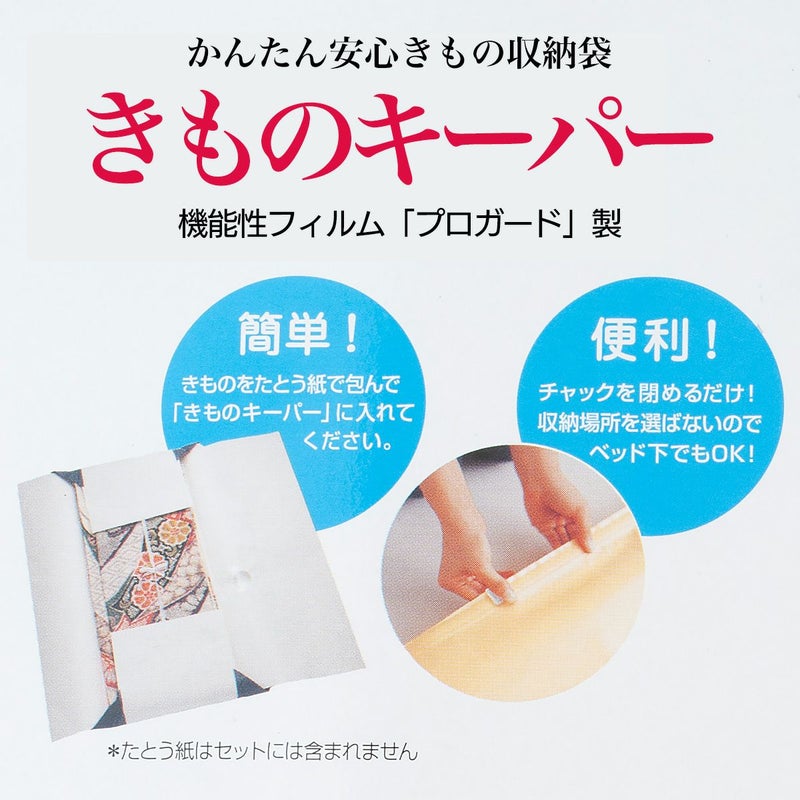 かんたん安心きもの収納袋「きものキーパー」です。 着物をたとう紙に入れ、「きものキーパー」にたとう紙ごと入れてください。 抗菌、抗酸化剤含有フィルム、ガスバリアフィルム、保護フィルムの三層構造になっており、大切な着物を湿気、カビ、虫害から守り、また着物の変色も防ぎます。 もう防虫剤は不要です。面倒な虫干しも不要です。頼りになる収納袋です!