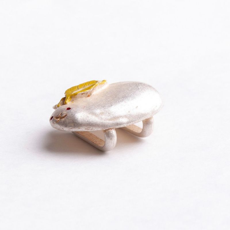 ぷっくりと思わず触りたくなるような愛らしい雪うさぎの帯留めです。目は南天の実、鼻と口は木の枝でできています。