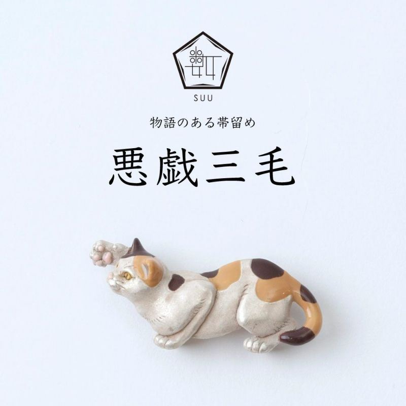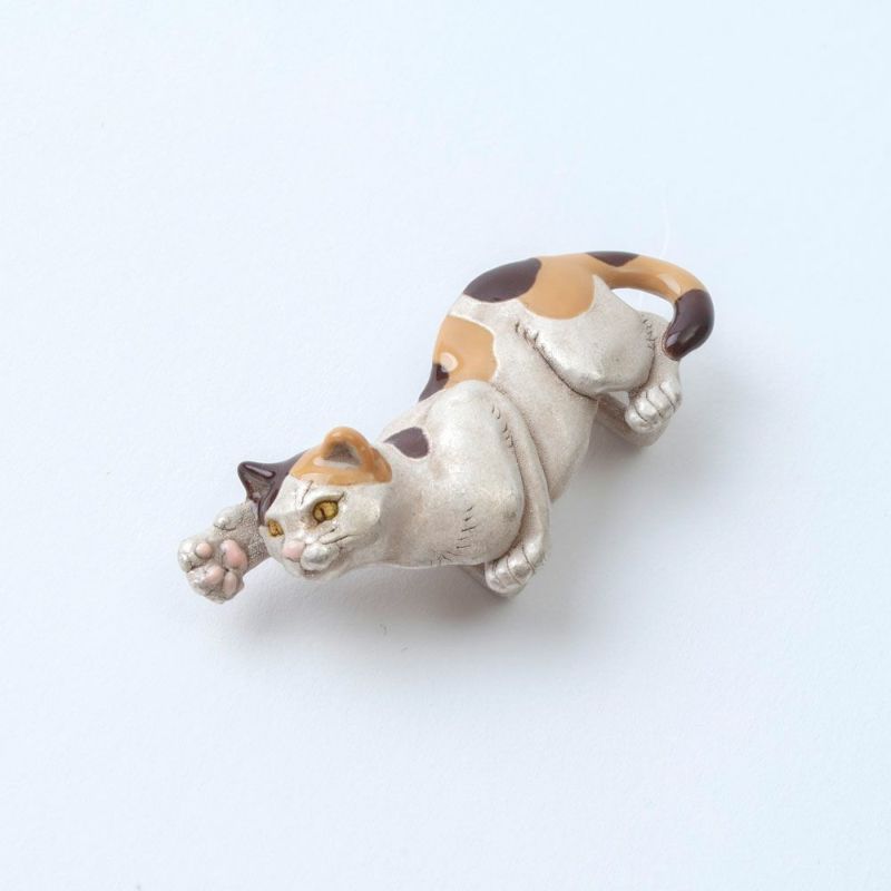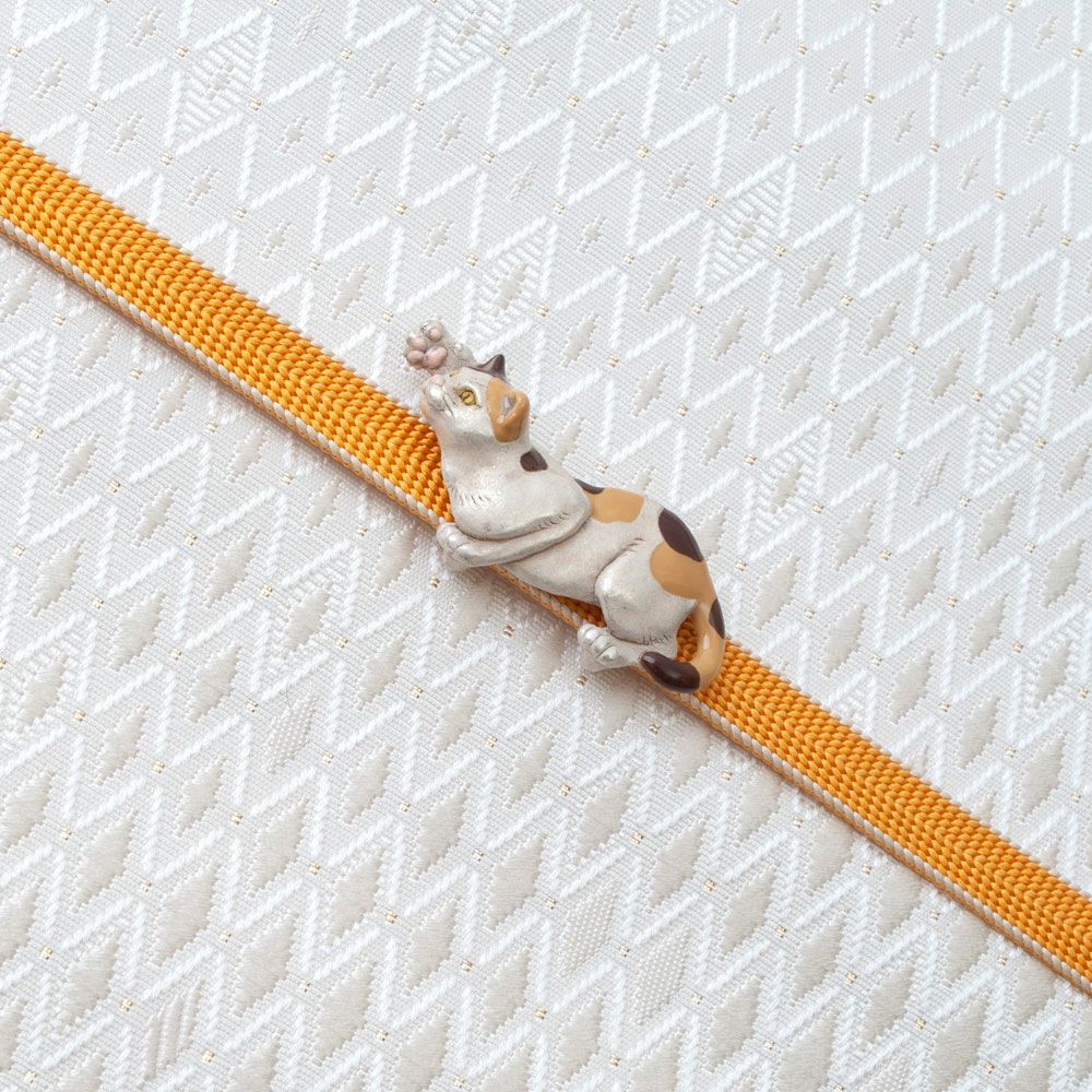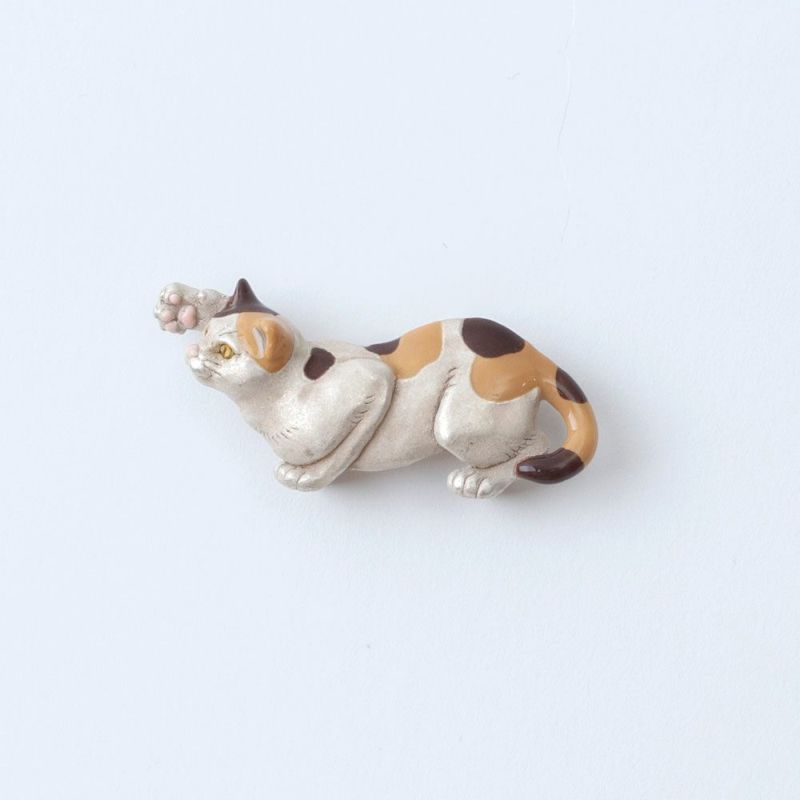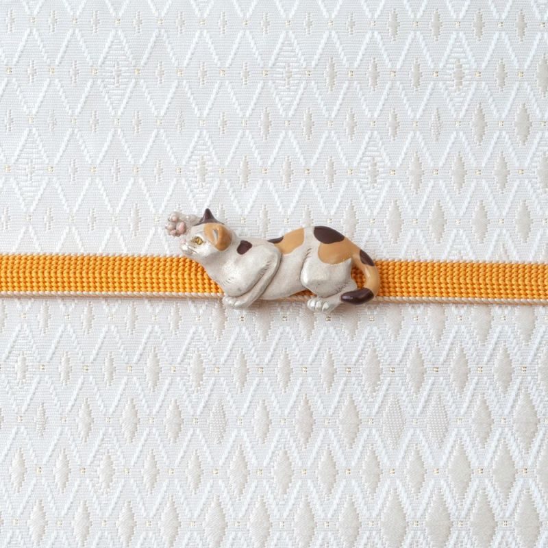 今にも強烈なネコパンチが繰り出されそうな三毛猫の帯留めです。