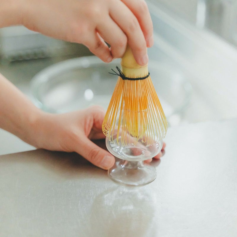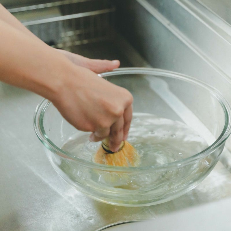 • 使った茶筅は、ぬるま湯で振り洗いします。洗剤やスポンジは使用せず、やさしく扱いましょう。取れない抹茶は指で優しくこすり 落としてください。