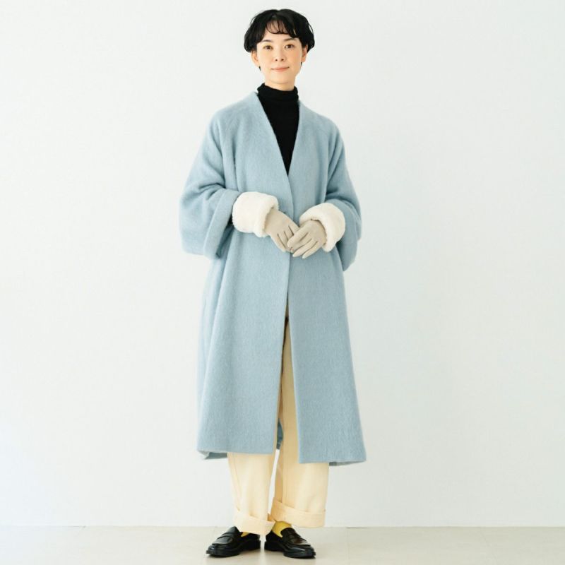 中に着る物を選ばないのがロングコートの良さ。長めの着丈でつくった【モヘアシャギーロングコート】なら、ボトムの丈を選ばずに合わせていただけます。
