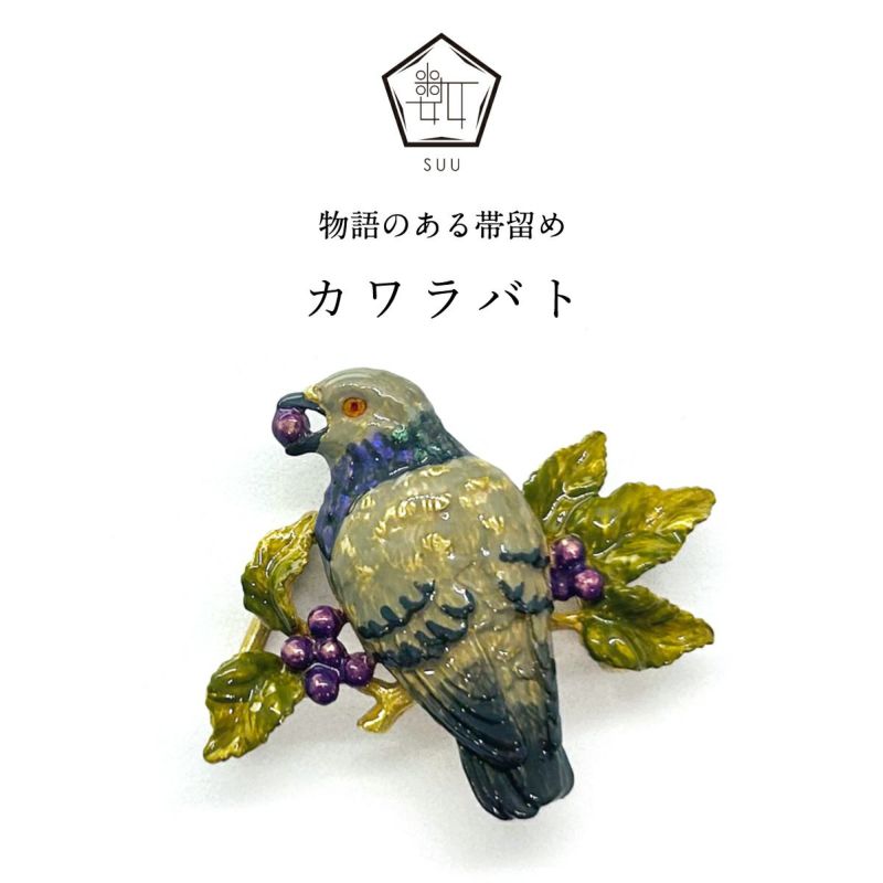 ムラサキシキブの実をついばむカワラバトをモチーフにした風流な帯留め。