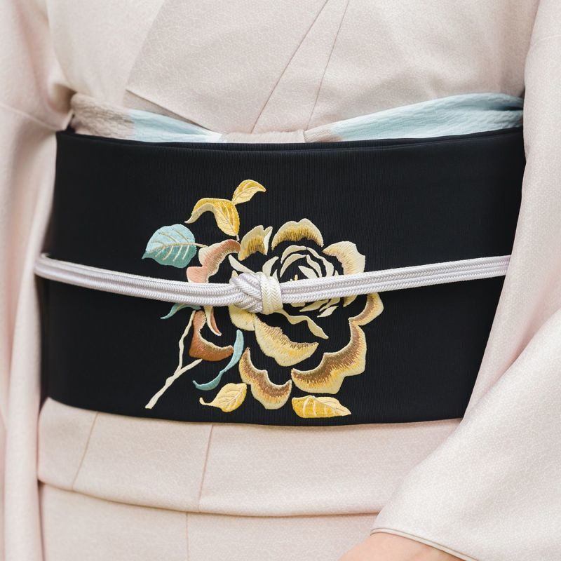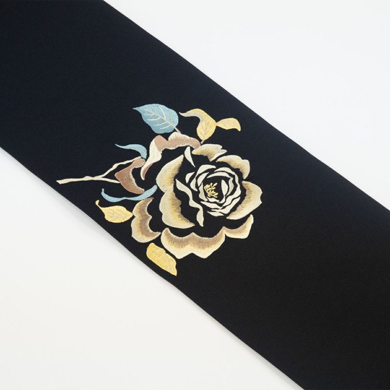 漆黒の地に浮かび上がる大輪の薔薇が目を引く【刺繍名古屋帯 アンティークローズ】