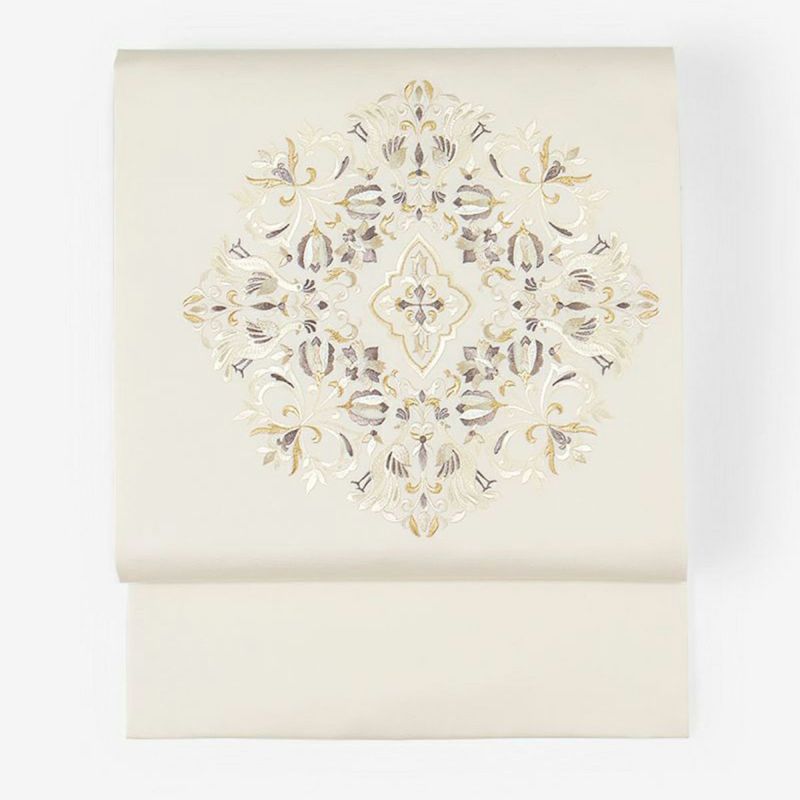 オフホワイトの柔らかな地にほどこされたメダイヨン柄刺繍は、左右対称のシンメトリーに美しく構成されており、端正さと格調高い印象を与えてくれます。