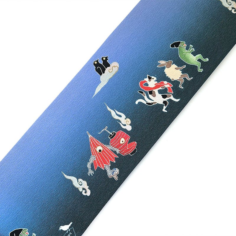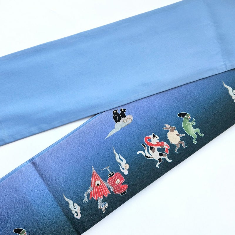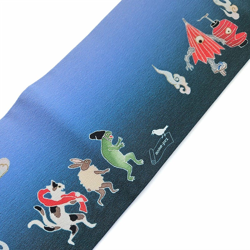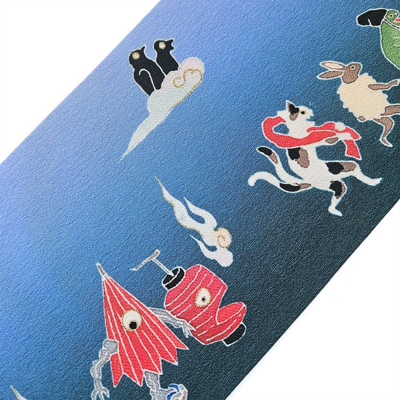 夕暮れをそぞろ歩く動物や妖怪たちが描かれています。 烏帽子をかぶった蛙や毛皮を着たウサギ、赤い手拭いを持った猫又。雲に乗っているのは鳥のお化けでしょうか。 世界観のあるユニークな半幅帯です。