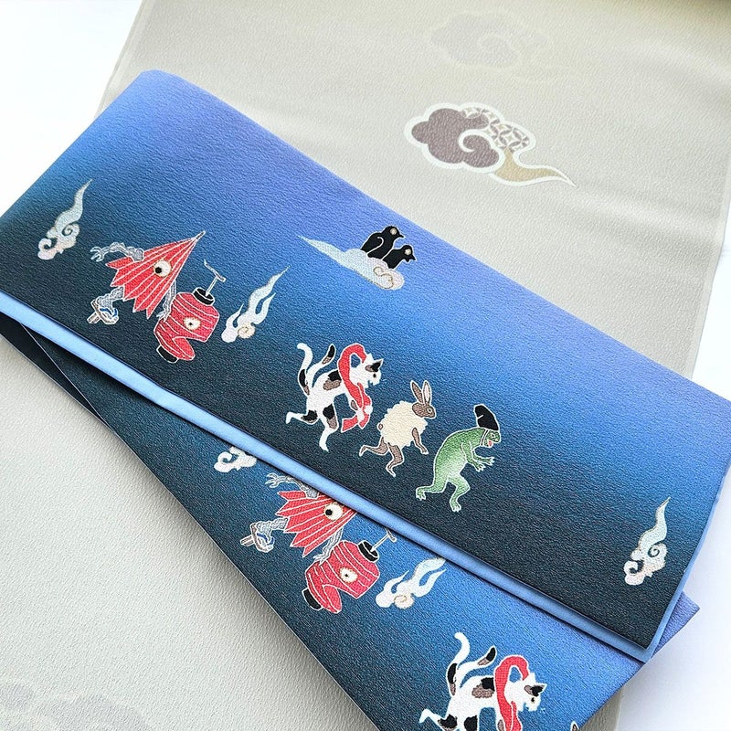 ユーモラスな動物や妖怪たちのデザイン 浴衣にも普段着物にもコーディネートしやすい半幅帯 絹によく似た手触りのシルジェリーを使用しました。