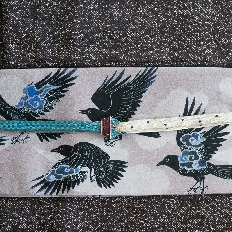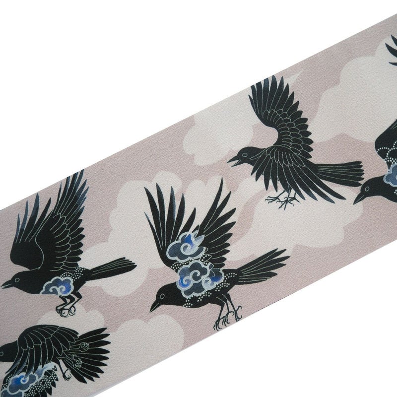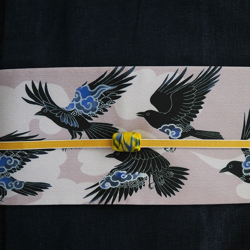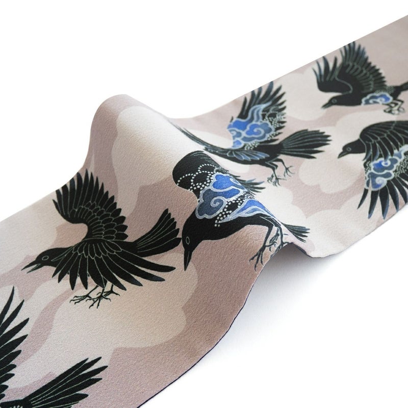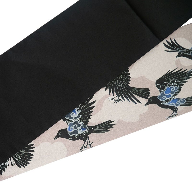 太陽の化身ともいわれ、天照大御神の使いとされる八咫烏を、モダンな意匠で表現しました。着物に半幅帯でこのデザインを取り入れて、神話の世界を感じるコーディネートをお楽しみください。