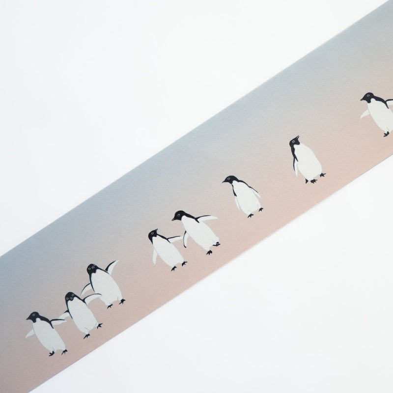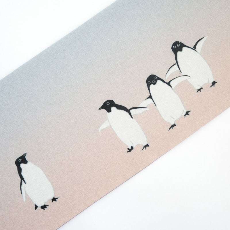 澄んだ水色から淡い桃色へと移ろうグラデーションが美しく、愛らしいアデリーペンギンの姿をいっそう引き立てています。