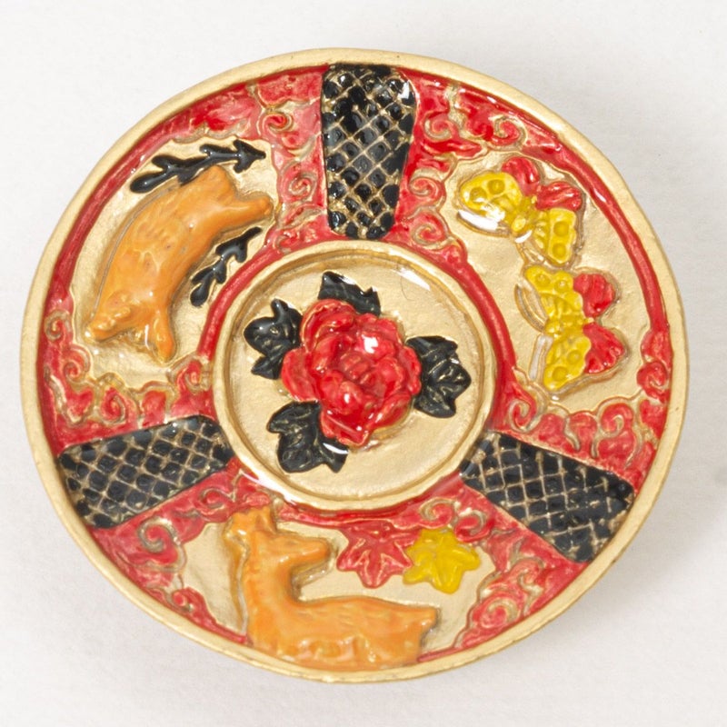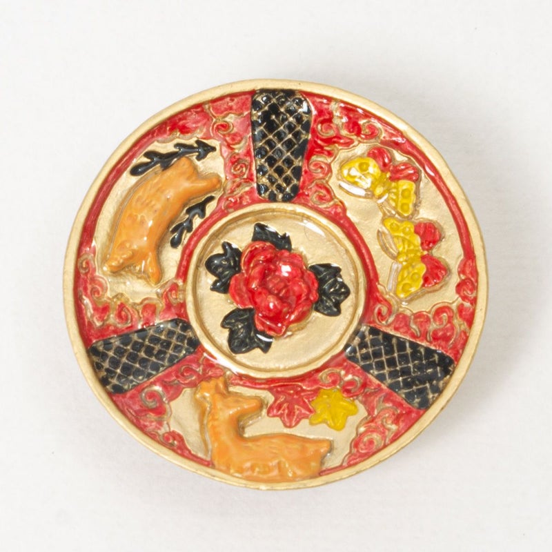 帯留めとなった絵皿の繊細なデザインは、花札でもおなじみの猪鹿蝶がモチーフとなっています。