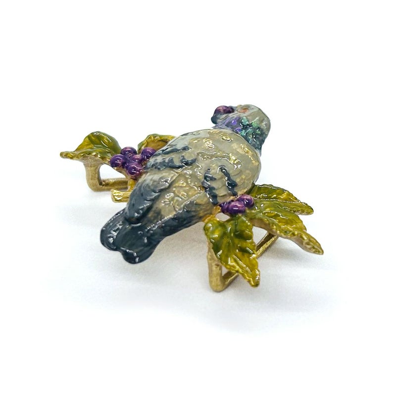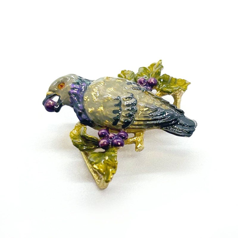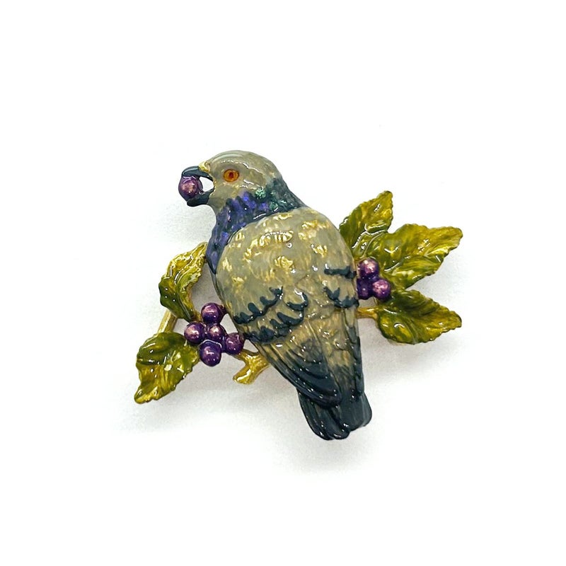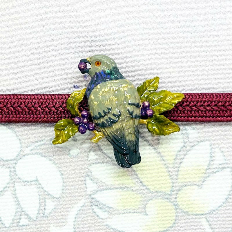 ムラサキシキブの実をついばむカワラバトをモチーフにした風流な帯留め。