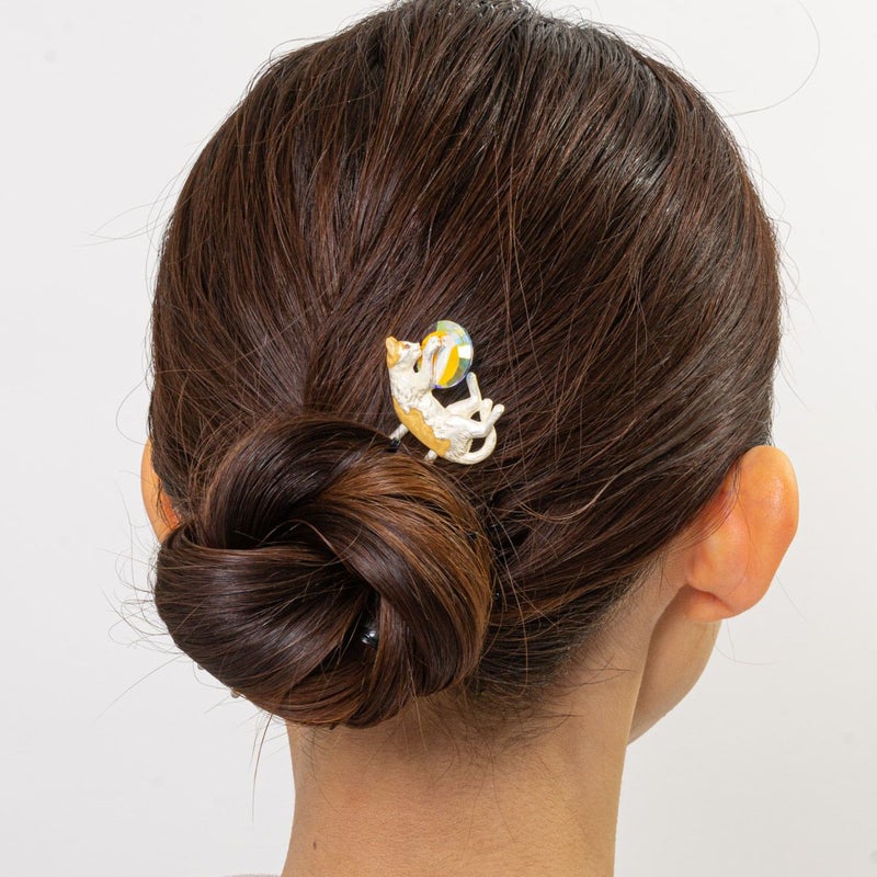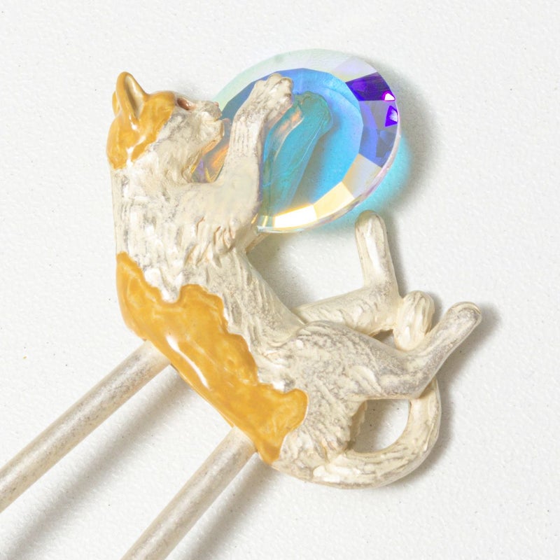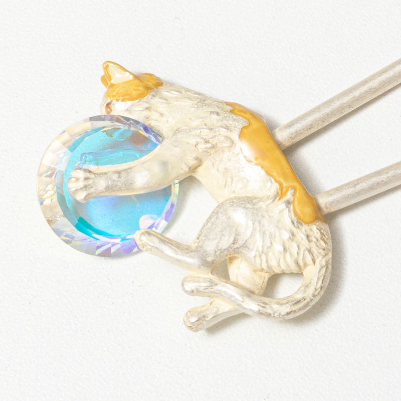 キラキラと光る大きなカットガラスにじゃれて遊ぶ猫のかんざしは、どちらの面も繊細に作りこまれ裏返しても違和感なく使うことが可能です。