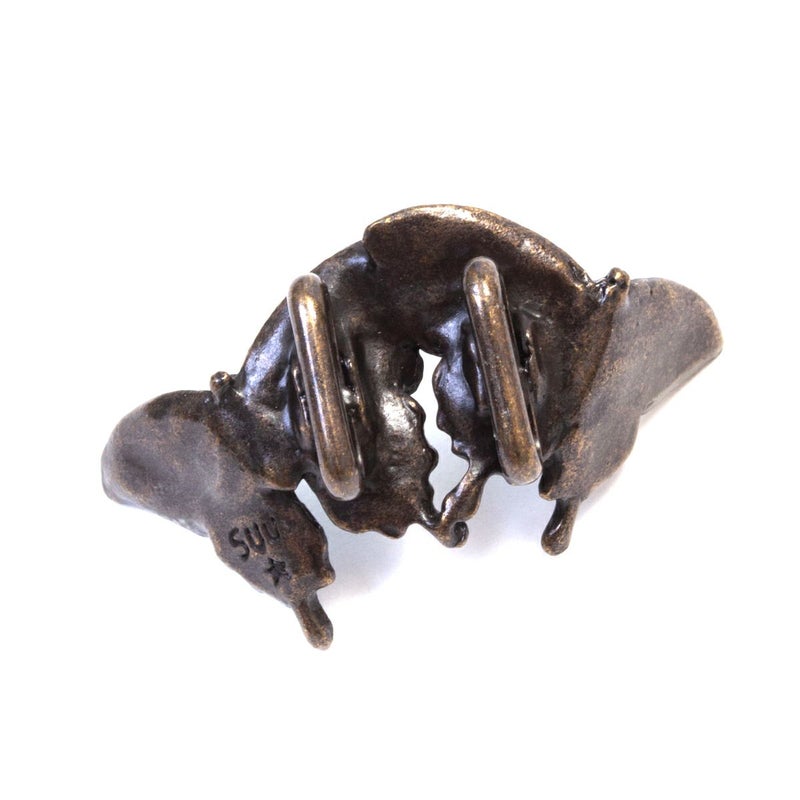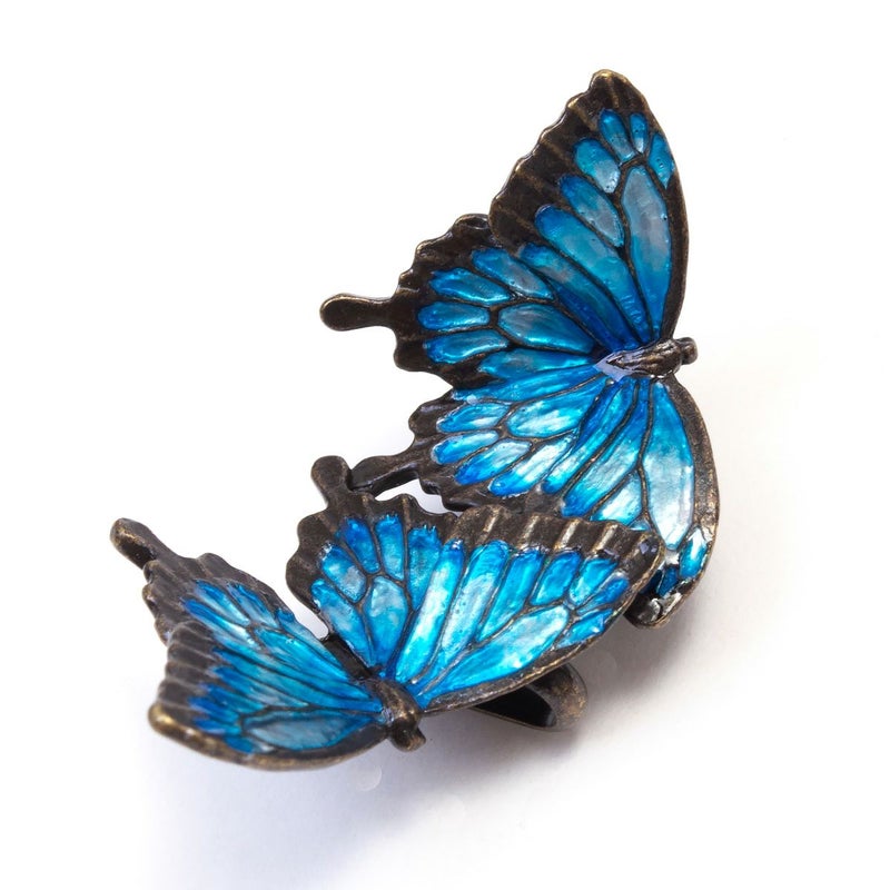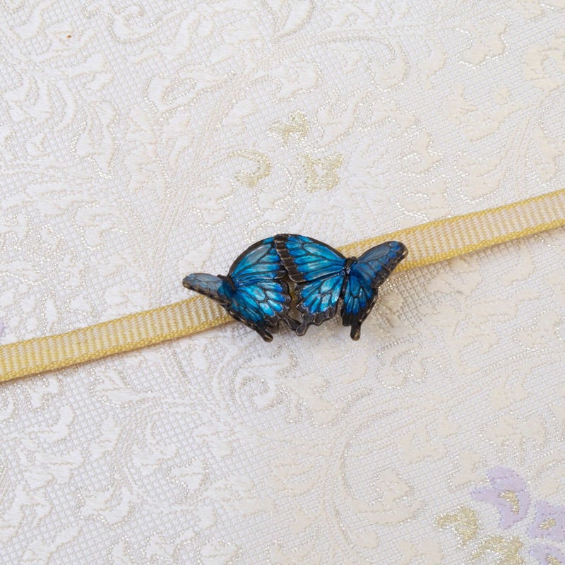 二羽のオオルリアゲハが仲良く飛び交う姿をそのまま形にした帯留め。