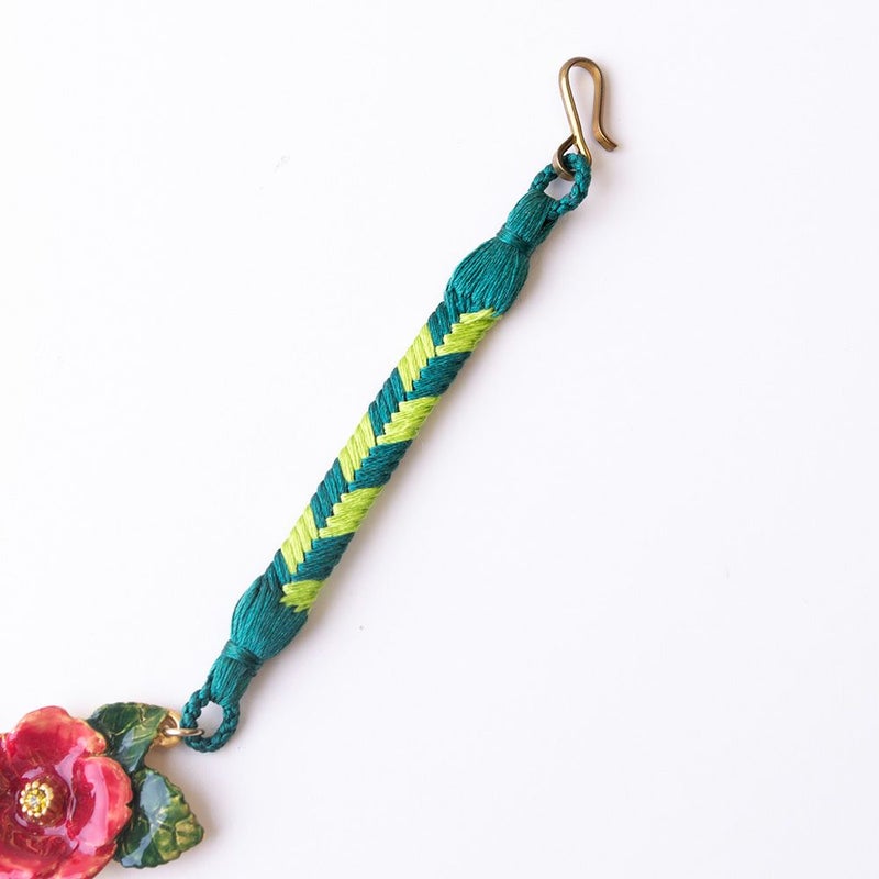 鮮やかな色合いが美しい椿が三輪並ぶ羽織紐です。