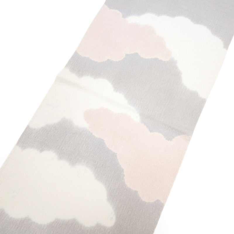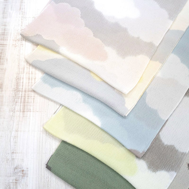 柔らかな空の情景を思わせる、雲の柄が美しい絞りの帯揚げです。 シボが大きくふっくらとした『うずらちりめん』の帯揚げ地を、縫い締め絞りによって染め分けて雲の文様を表しています。 一点一点異なる表情をもち、絞りならではの優しい色のにじみと柔らかな雰囲気が魅力。 お出掛けから晴れの日の装いまで、繊細な技が生み出す豊かな表情が、装いに格別な深みを添えてくれます。