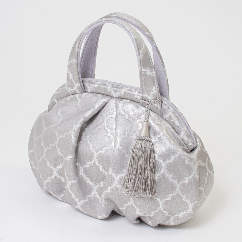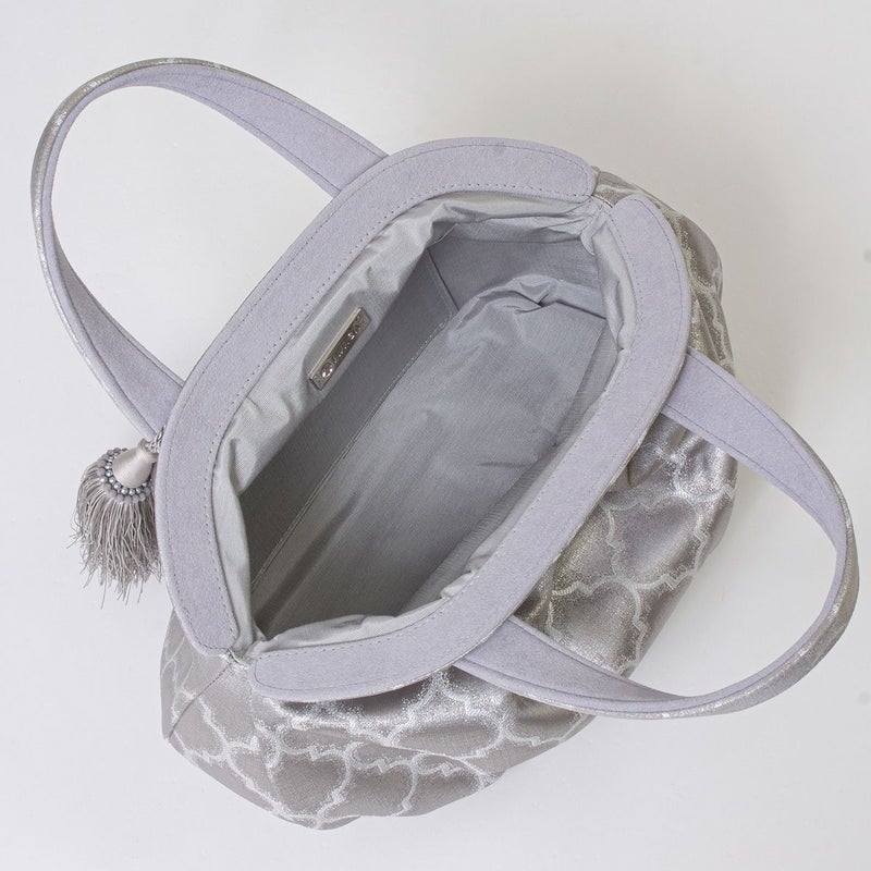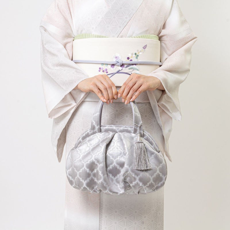 本体は帯や着物と相性のいい優しく全体に艶のある生地をつかい、フォーマルなシーンでも活躍できるように持ち手を生地で仕立てました。