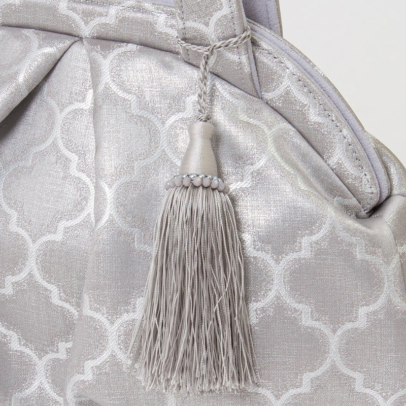 バッグはコーディネートの中でも大きなアイテムです。 華やかなシーンではアクセサリー感覚でお持ちいただけるように、取り外し式のビーズ付きタッセルが付いています。