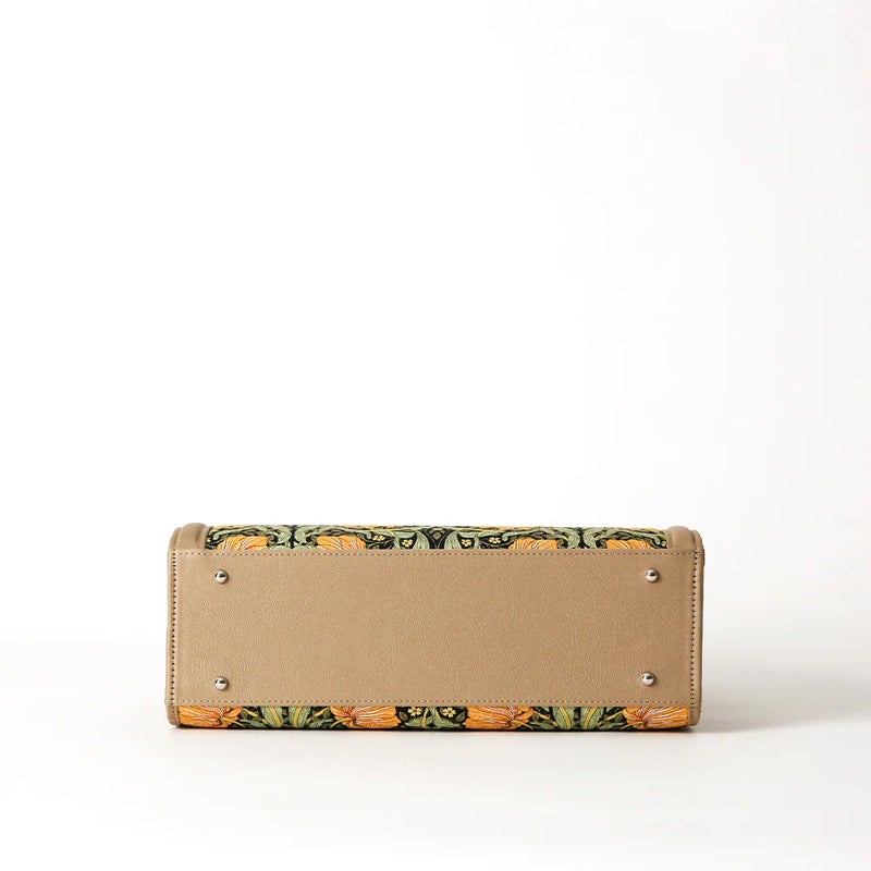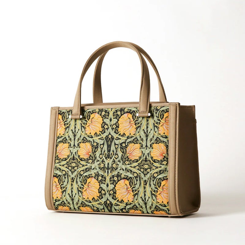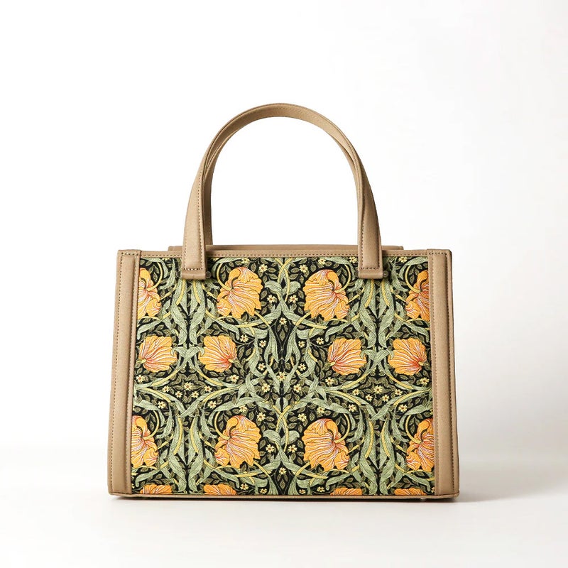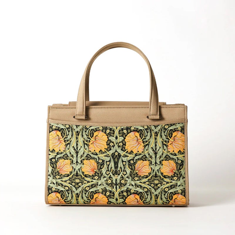 着物のコーディネートを一層楽しんで頂けるバッグを目指し、すっきりとした美しい佇まいに華やかなウィリアムモリスのピンパネル柄を合わせました。