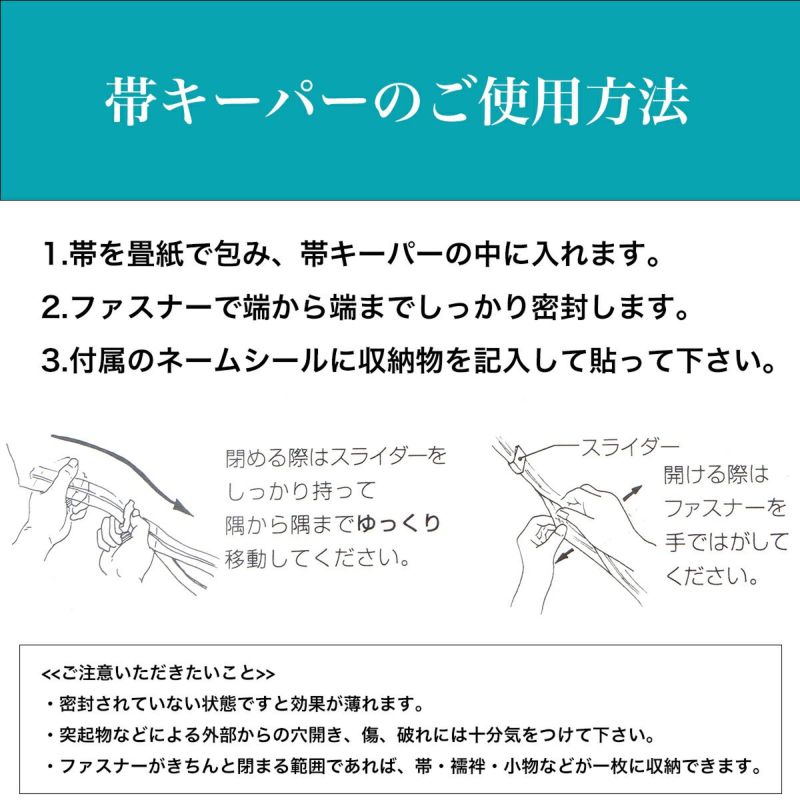 シーズンオフになった帯の保管には「帯キーパー」での保存がお薦めです。 たとう紙に包んで、キーパーの袋に入れてファスナーを締めるだけでOK! 一袋に付き、帯なら2〜3枚程度が収納可能です。