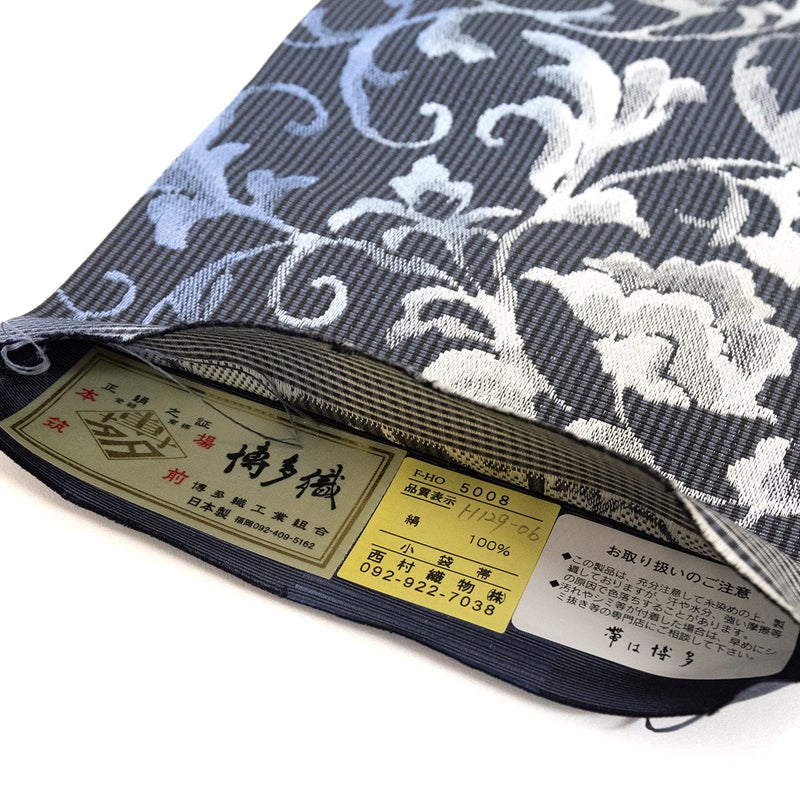 博多帯ならではのハリと艶のある帯地は、たくさんのタテ糸にヨコ糸を高密度で織り込んでいるため、しなやかさと丈夫さをあわせ持っています。