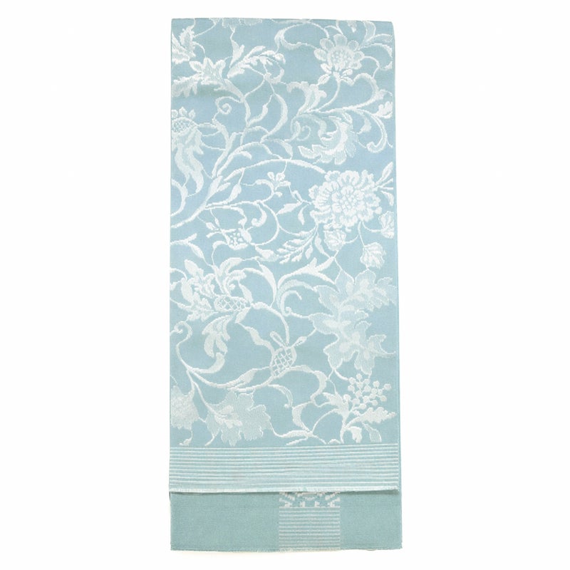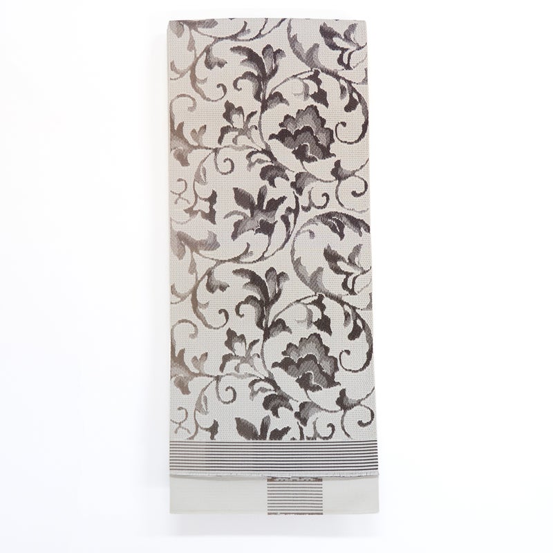 【唐花暈し】は、流れるような唐草をモチーフに、たて糸の細かな色の変化でグラデーションを表現した、上品で優雅さのある帯です。